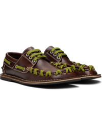 Buffed calfskin boat shoes. · Whipstitching at square moc toe · Lace-up closure · Pinched seam at heel counter · Buffed calfskin and suede lining · Topstitching at welt · Treaded rubber sole Supplier color: Brown Upper: calfskin. Sole: rubber. Made in Portugal 252552M239001