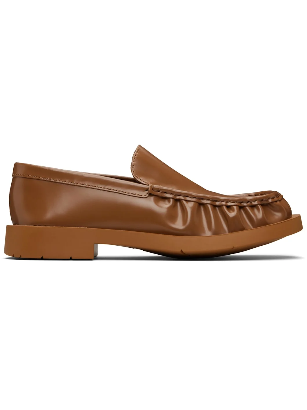 Polished calfskin loafers. · Gathering at square moc toe · OrthoLite® Recycled™ footbed · Buffed leather lining · Textured rubber sole Supplier color: Brown Upper: calfskin. Sole: rubber. Made in Viet Nam 252552M231001