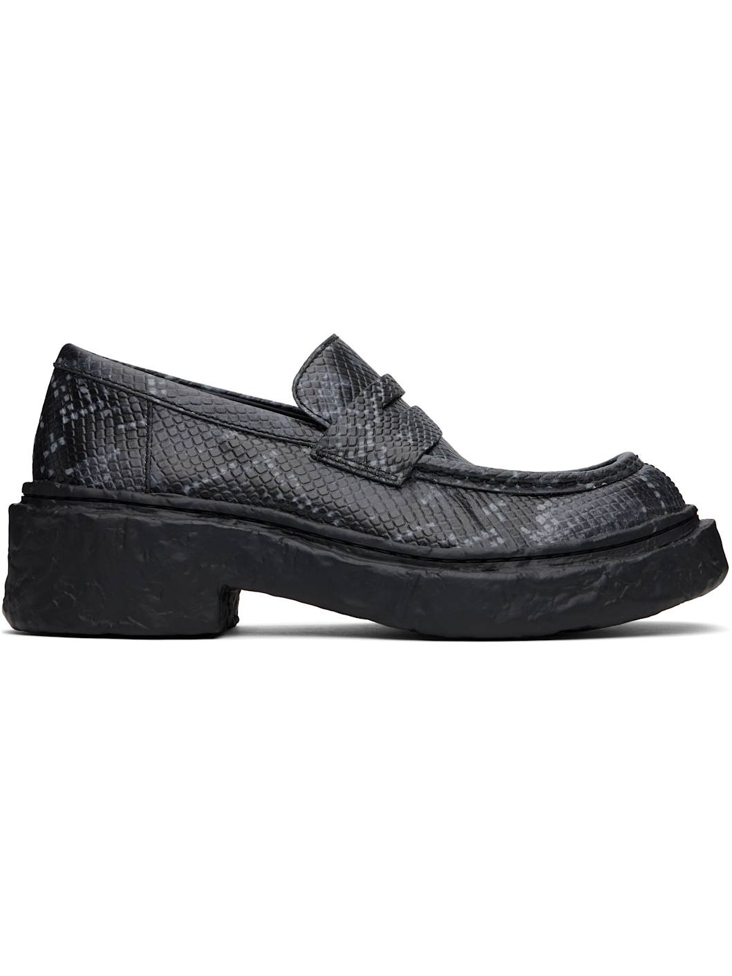 Snake-embossed leather loafers in gray. · Moc toe · Strap with cutout at vamp · Padded collar · OrthoLite® Recycled™ footbed · Buffed leather and suede lining · Textured midsole and heel · Textured rubber sole · Heel: H2" Supplier color: Gray/Black Upper: leather. Sole: rubber. Made in Viet Nam 251552M231002