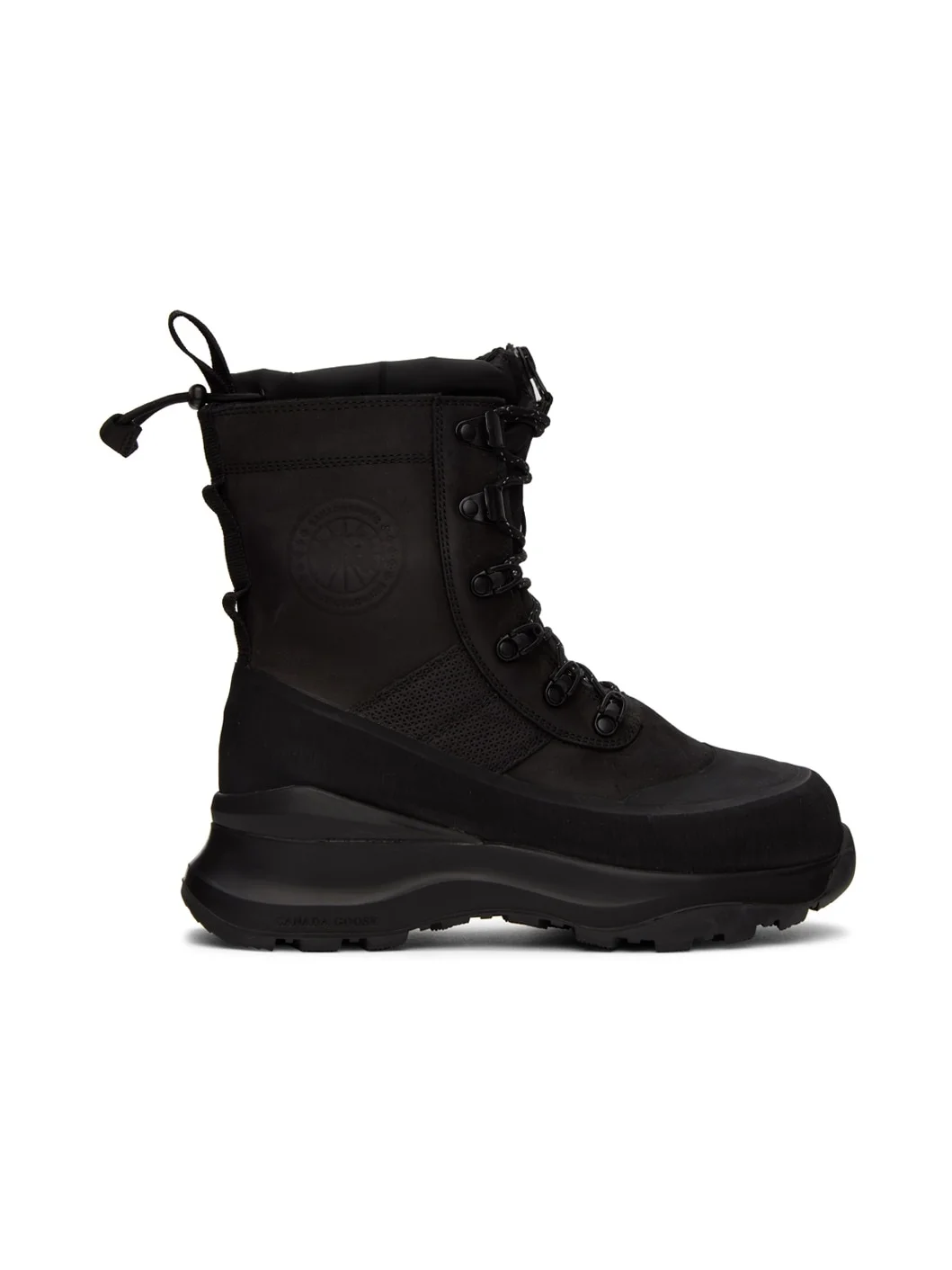 Calf-high paneled HDry® coated suede and nylon taffeta boots in black. Waterproof. · Lace-up closure · Zip gusset at vamp · Bungee-style drawstring at padded collar · Webbing pull-loop at heel collar · Logo graphic embossed at outer sides · Logo embossed at insulated rubber platform midsole · Treaded rubber outsole · Platform: H1.5 in Supplier color: Black Upper: leather, synthetic, textile. Sole: rubber.