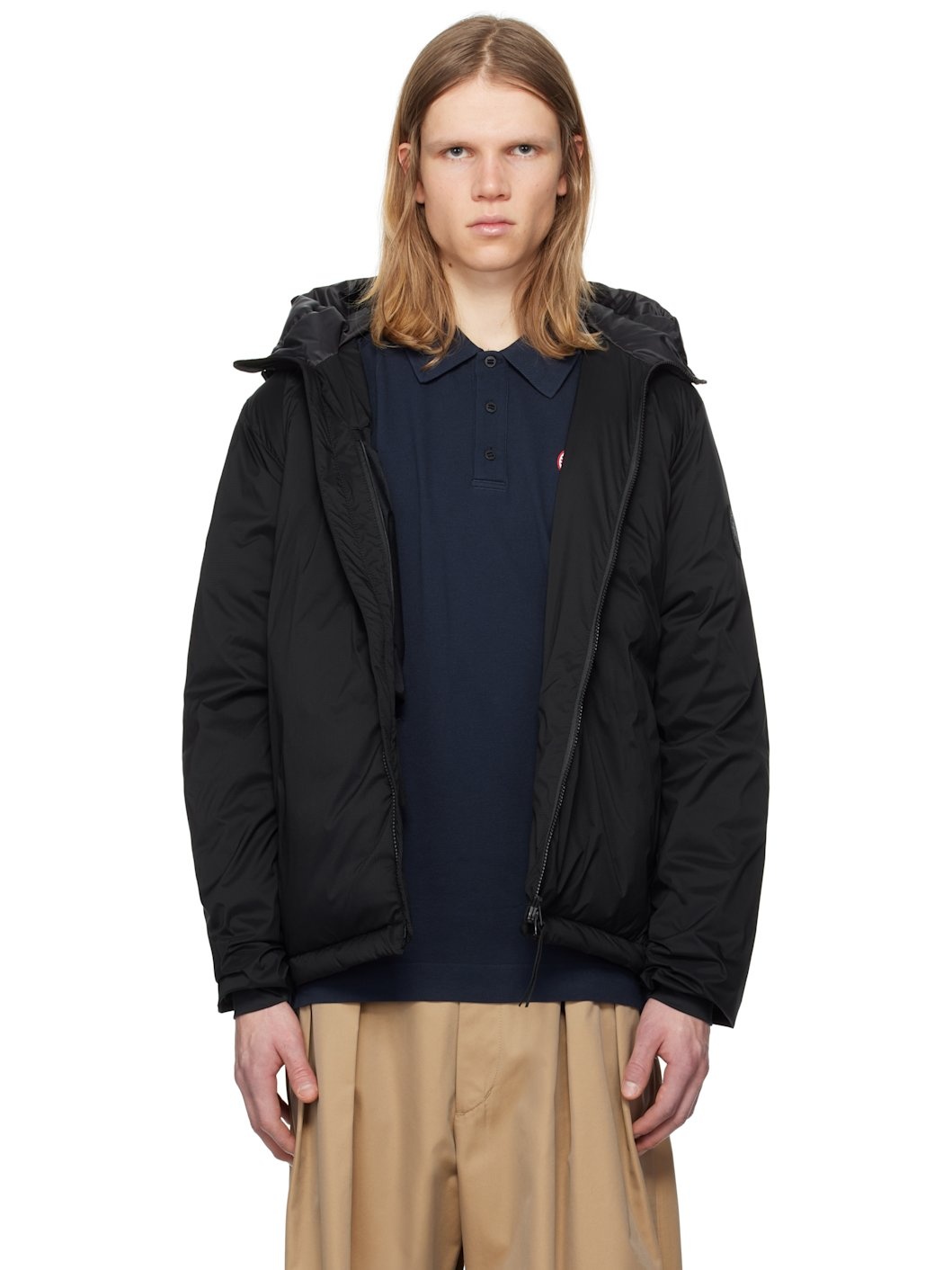 Packable down-filled nylon ripstop jacket. Lightweight, water-repellent, and wind-resistant. · Bungee-style drawstring at hood · Stand collar · Two-way zip closure · Zip pockets · Concealed bungee-style drawstring at droptail hem · Embroidered logo patch at sleeve · Power Stretch® jersey cuffs · Zip pocket and patch pocket at interior · Partial ripstop and quilted satin lining Part of the Black Label collection. Supplier color: Black Fill: 90% duck down, 10% duck feathers. Body: 100% polyamide. Lining 1: 100% polyamide. Lining 2: 100% polyester. Made in Canada 251014M180003
