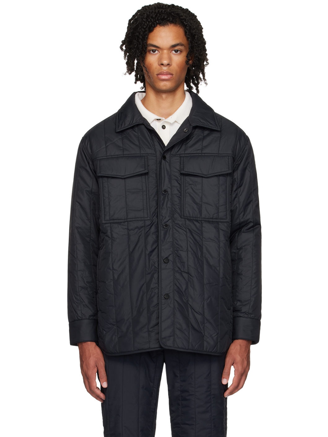 Quilted and TENCEL™ Lyocell-filled nylon ripstop jacket. Lightweight, water-repellent, wind-resistant, and durable. · Spread collar · Press-stud closure at front and cuffs · Flap pockets at chest · Zip pockets at waist and interior · Shirttail hem · Embroidered logo patch at sleeve · Full ripstop lining · Logo-engraved gunmetal-tone hardware Supplier color: Black Body: 100% polyamide. Fill: 100% lyocell. Made in Romania 242014M178055