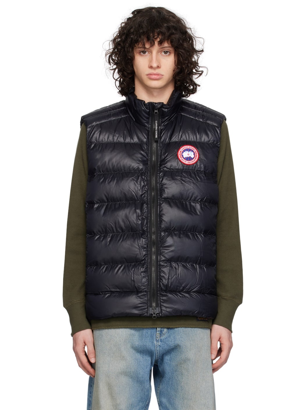 Packable down-filled quilted nylon ripstop vest. Lightweight, water-repellent, wind-resistant, and durable. · Stand collar · Two-way zip closure · Embroidered logo patch at chest · Zip pockets · Patch pocket at interior · Fully lined Supplier color: Black/Noir Fill: 90% duck down, 10% duck feather. Body: 100% polyamide. Lining: 100% polyamide. Made in Canada 241014M178026