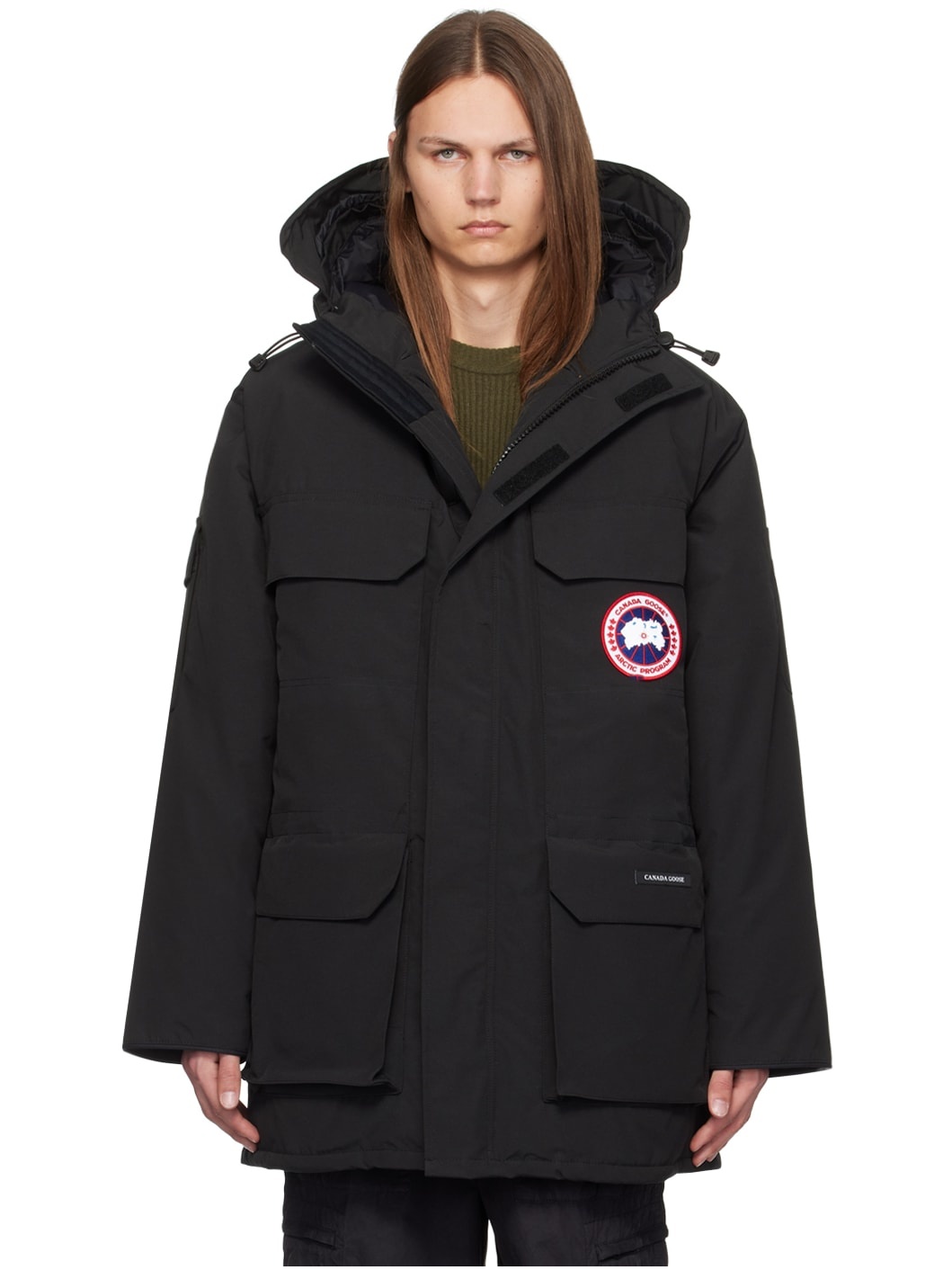 Oversized RDS-certified down-filled Arctic Tech® polyester- and cotton-blend duck canvas jacket. Water-repellent and durable. · Detachable brim at hood · Bungee-style drawstring at hood and interior waist · Funnel neck · Two-way zip closure with velcro placket · Flap and zip pockets · Logo patches at front · Flap pocket at sleeve · Pen slots at sleeve · Inset rib knit cuffs · Webbing strap with logo patch at back collar · Zip and patch pockets at interior · Elasticized shoulder straps at interior · Snow skirt with elasticized hem at interior · Full satin lining Supplier color: Black Fill: 80% duck down, 20% duck feather. Body: 84% polyester, 16% cotton. Lining: 100% polyester. Made in Canada 242014M178013