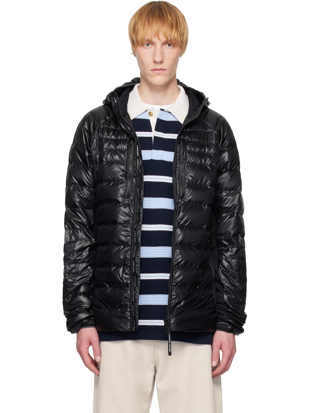 Packable down-filled and quilted stretch recycled nylon ripstop jacket. Stretch fleece panels throughout. · Packs into waist pocket · Lightweight, water-repellent, and wind-resistant · Elasticized trim at hood and cuffs · Stand collar · Two-way zip closure · Zip pockets · Raglan sleeves · Embroidered logo patch at sleeve · Reflective trim at back collar · Patch pockets at interior · Full nylon satin lining Supplier color: Black Fill: 90% goose down, 10% goose feather. Body 1: 100% polyamide. Body 2: 93% polyester, 7% elastane. Lining: 100% polyamide. Made in Canada 251014M178026