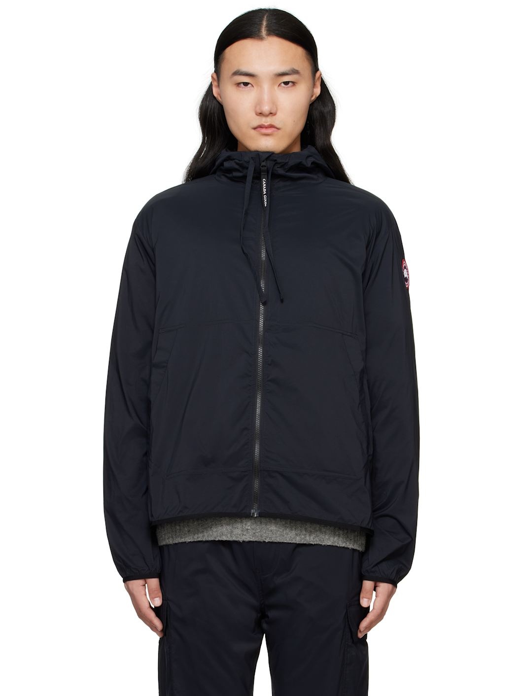 Packable nylon ripstop jacket. Wind-resistant, water-repellant, lightweight, and durable. · Drawstring at hood · Funnel neck · Zip closure · Patch pockets · Elasticized hem and cuffs · Embroidered logo patch at sleeve · Unlined Supplier color: Black 100% polyamide. Made in Albania 251014M180011