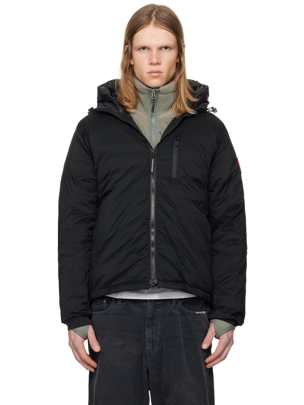 Packable down-filled nylon ripstop jacket. Lightweight, water-repellent, and wind-resistant. · Bungee-style drawstring at hood · Funnel neck · Two-way zip closure · Zip pockets · Concealed bungee-style drawstring at droptail hem · Embroidered logo patch at sleeve · Power Stretch® jersey cuffs · Zip pocket and patch pocket at interior · Partial ripstop and quilted satin lining Supplier color: Black Fill: 90% duck down, 10% duck feathers. Body: 100% polyamide. Lining 1: 100% polyester. Lining 2: 100% polyamide. Made in Canada 251014M180005