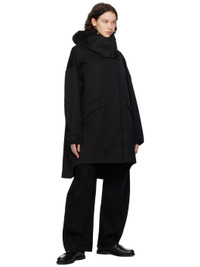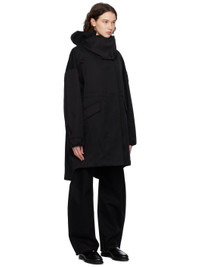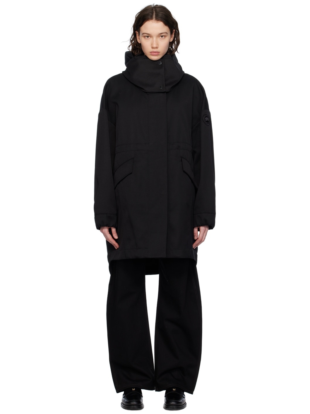 Polyester- and cotton-blend twill coat. · Detachable hood at stand collar · Two-way zip closure with press-stud placket · Flap pockets · Droptail hem · Metal eyelets at underarms · Embroidered logo patch at sleeve · Adjustable press-stud tab at elasticized cuffs · Taped seams at interior · Patch pockets at interior · Bungee-style drawstring at interior waist · Partial twill lining Supplier color: Black Body: 67% polyester, 33% cotton. Lining: 100% polyester. Made in Bulgaria 241014F063004