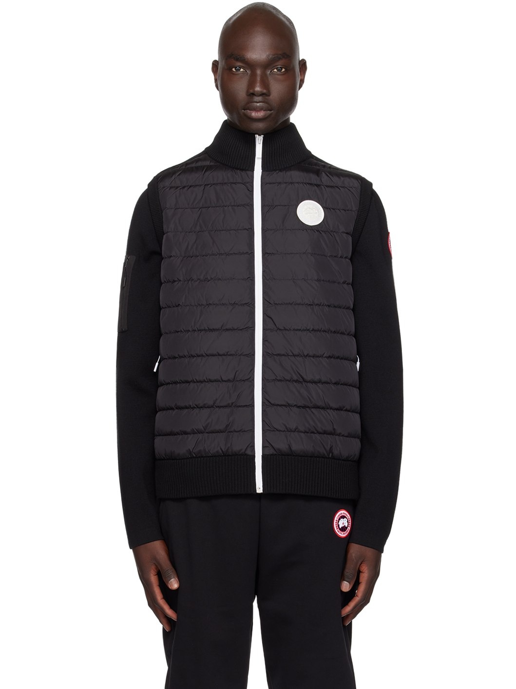 Paneled down-filled quilted nylon HyBridge® taffeta and rib knit wool vest. · Rib knit stand collar, hem, and armscyes · Zip closure · Embroidered logo patch at chest · Zip seam pockets · Partial satin lining Supplier color: Black/White Fill: 90% white duck down, 10% white duck feather. Body 1: 100% wool. Body 2: 100% polyamide. Lining: 100% polyamide. Made in Canada 232014M178012