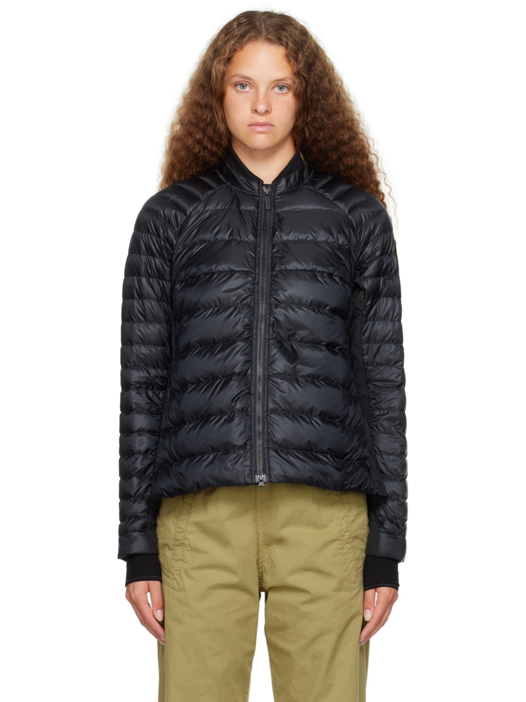 Down-filled quilted AcclimaLuxe recycled nylon ripstop jacket. Packable, water-repellent, wind-resistant, and durable. · Paneled construction · Rib knit stand collar · Two-way zip closure · Zip pockets · Raglan sleeves · Logo patch at sleeve · Partially elasticized cuffs · Reflective trim and inverted box pleat at back · Detachable elasticized shoulder straps at interior · Patch pockets and storm flap at interior · Partially lined Supplier color: Black Fill: 80% white goose down, 20% white goose feathers. Body: 100% recycled polyamide. Body 2: 100% polyamide. Lining: 100% recycled polyamide. Made in Canada 232014F061081
