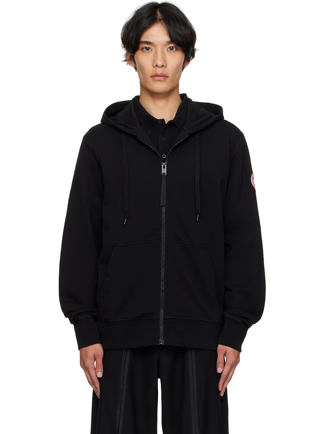 Cotton French terry hoodie. · Drawstring at hood · Zip closure · Patch pockets at waist · Rib-knit hem and cuffs · Embroidered logo patch at sleeve Supplier color: Black 100% cotton. Made in Portugal 252014M202004