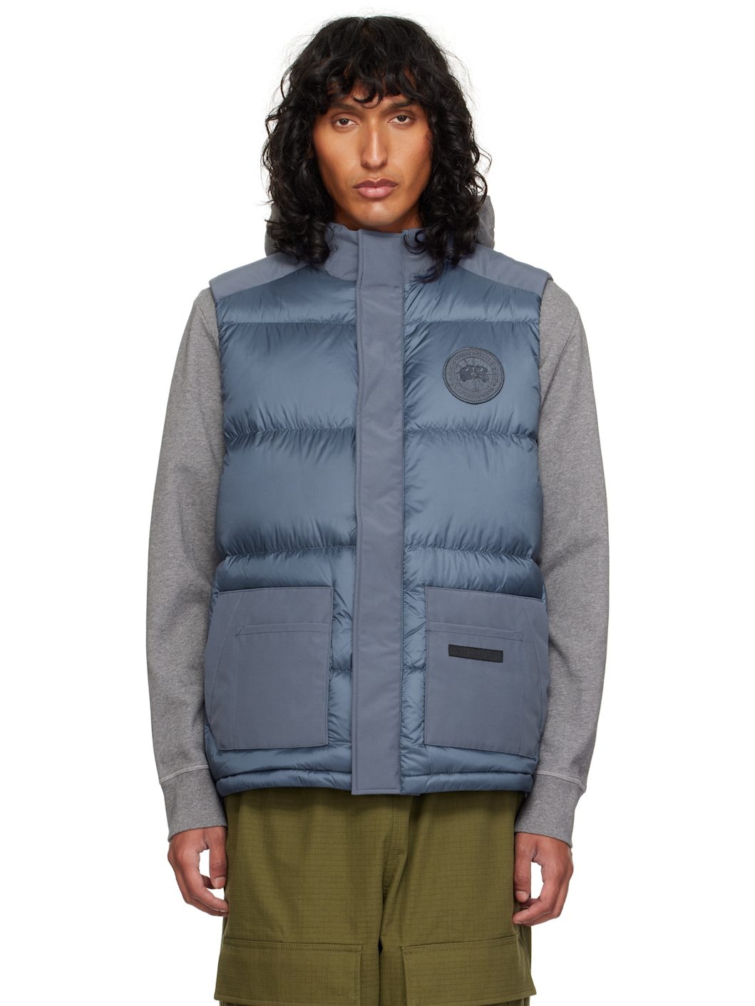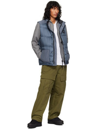Down-filled and quilted nylon ripstop and Arctic Tech® polyester-blend taffeta vest. Water-repellent, wind-resistant, lightweight, and durable. · Stand collar · Two-way zip closure with press-stud placket · Embroidered logo patch at chest · Patch pockets · Webbing strap with logo patch at back collar · Welt pockets at interior · Full nylon taffeta lining Part of the Paradigm collection. Supplier color: Ozone blue Fill: 90% duck down, 10% feathers. Body 1: 100% polyamide. Body 2: 84% polyester, 16% cotton. Lining: 100% polyamide. Made in Canada 242014M178029