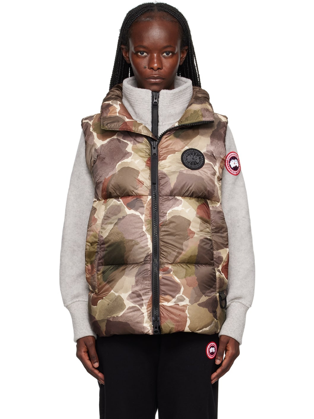 Lightweight down-filled quilted recycled nylon ripstop vest. Graphic pattern printed throughout. · Water-repellent and wind-resistant · Funnel neck · Two-way zip closure · Embroidered logo patch at chest · Zip pockets · D-ring hardware at front · Concealed bungee-style drawstring at hem · Zip and mesh pocket at interior · Fully lined Supplier color: Botanical print Fill: 90% duck down, 10% duck feather. 100% polyamide. Made in Canada 232014F068001