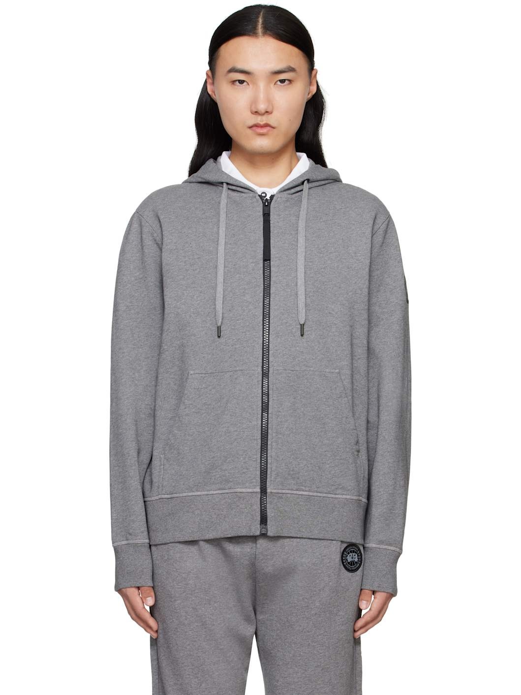 Cotton French terry hoodie. · Drawstring at hood · Zip closure · Patch pockets · Rib-knit hem and cuffs · Embroidered logo patch at sleeve Part of the Black Label collection. Supplier color: Stone Heather 100% cotton. Made in Portugal 251014M202005
