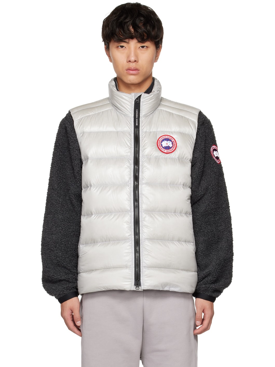 Down-filled quilted nylon ripstop vest. Water-repellent, wind-resistant, lightweight, and packable. · Stand collar · Two-way zip closure · Textile logo patch at chest · Zip pockets at waist · Patch pocket at interior · Full ripstop lining Supplier color: Silverbirch Fill: 90% down, 10% feathers. Body: 100% nylon. Lining: 100% nylon. Made in Canada 231014M178011