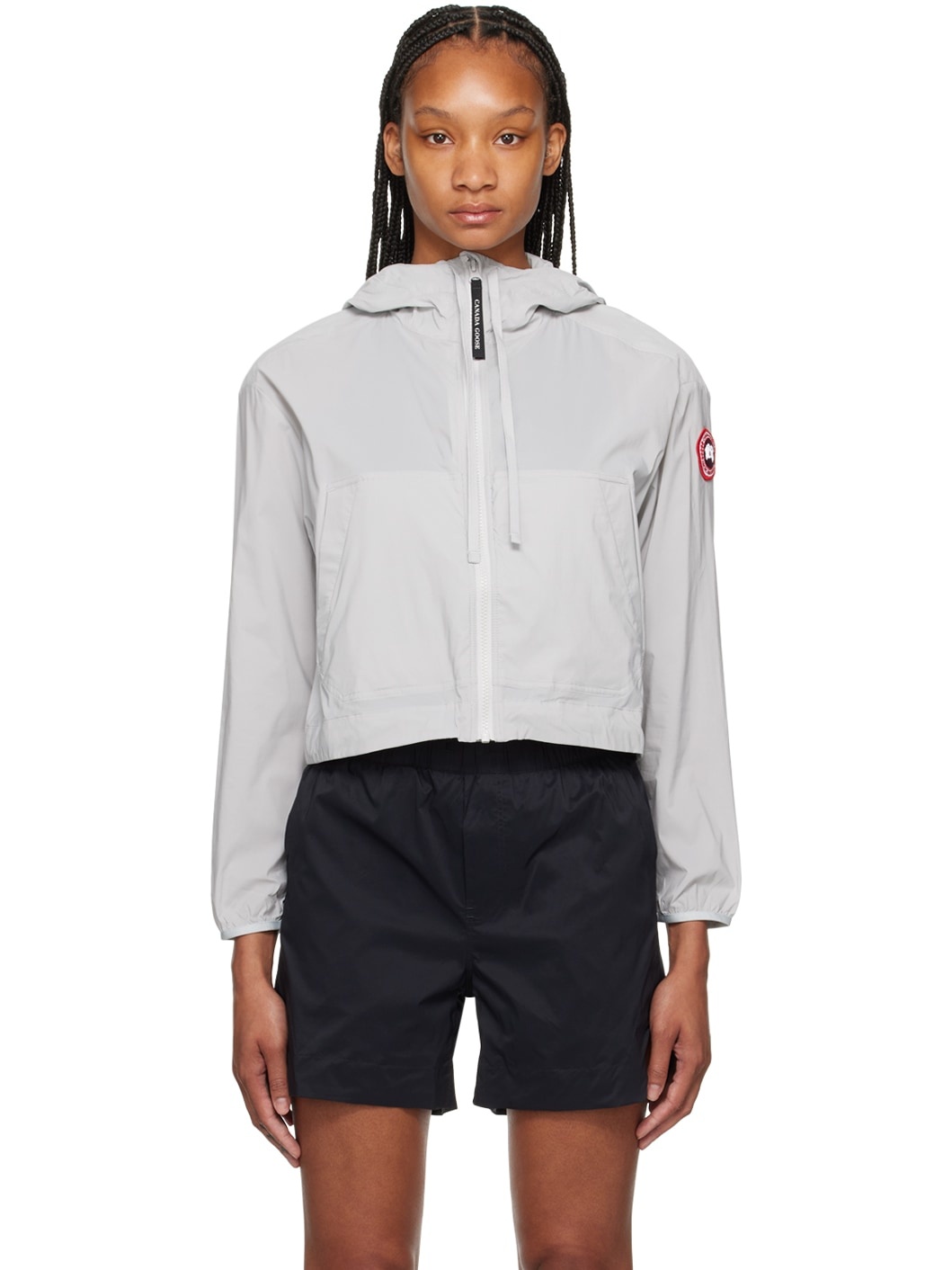 Lightweight nylon ripstop jacket. · Drawstring at hood · Zip closure · Patch pockets · Cord-lock drawstring at cropped hem · Embroidered logo patch at sleeve · Elasticized cuffs · Unlined Supplier color: Silverbirch 100% polyamide. Made in Albania 242014F063000
