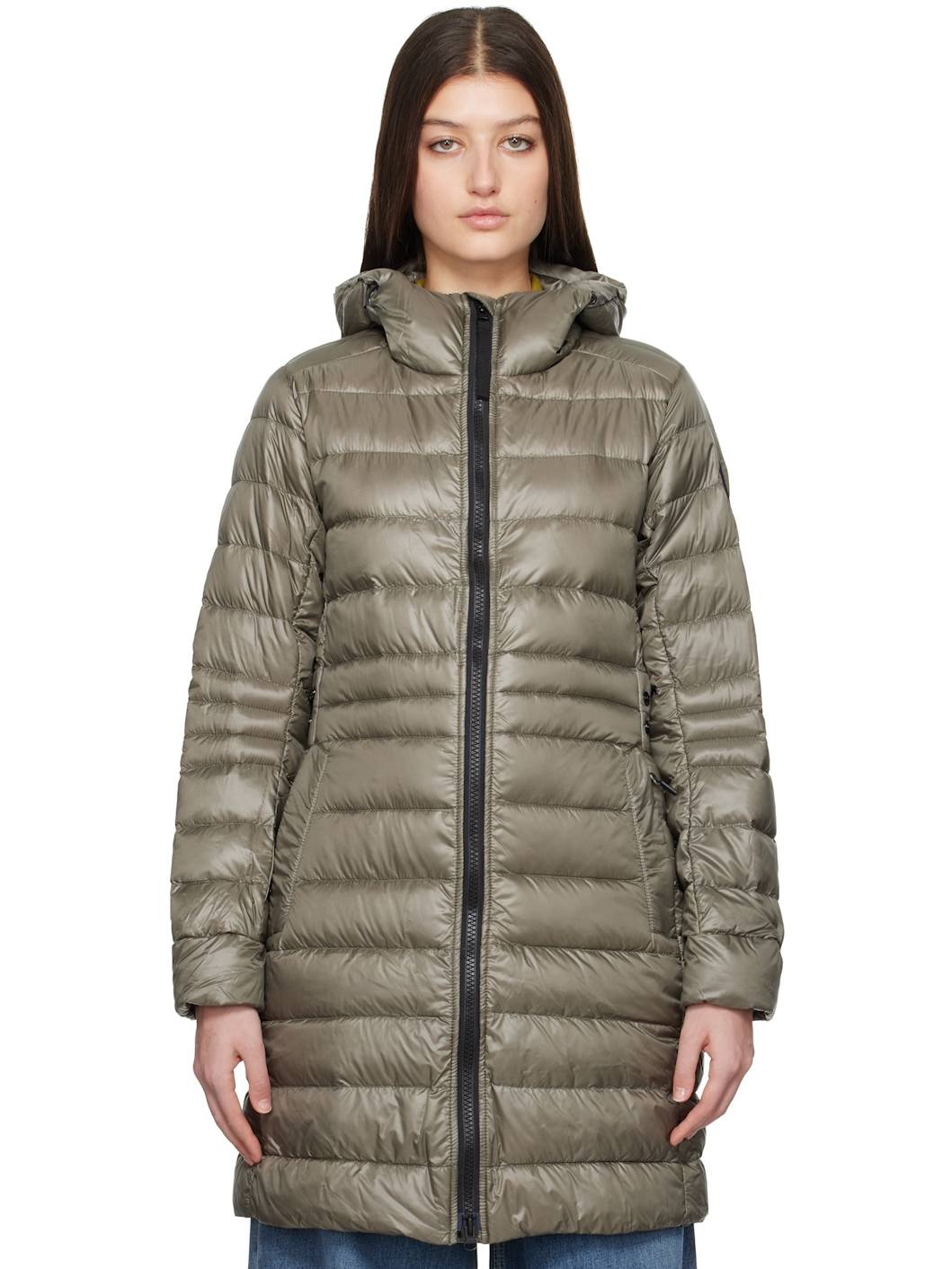 Down-filled and quilted recycled nylon ripstop jacket. Packable, lightweight, water-repellent, and wind-resistant. · Bungee-style drawstring at hood · Two-way zip closure · Zip pockets · Logo patch at sleeve · Inset Power Stretch® jersey cuffs · Reflective trim at back collar · Integrated adjustable press-stud strap at back waist · Press-stud vents at back hem · Patch pockets at interior · Detachable elasticized shoulder straps at interior · Fully lined Part of the Black Label collection. Supplier color: Smokey sage Fill: 90% duck down, 10% duck feather. Body: 100% recycled polyamide. Lining: 100% polyamide. Made in Canada 251014F061016