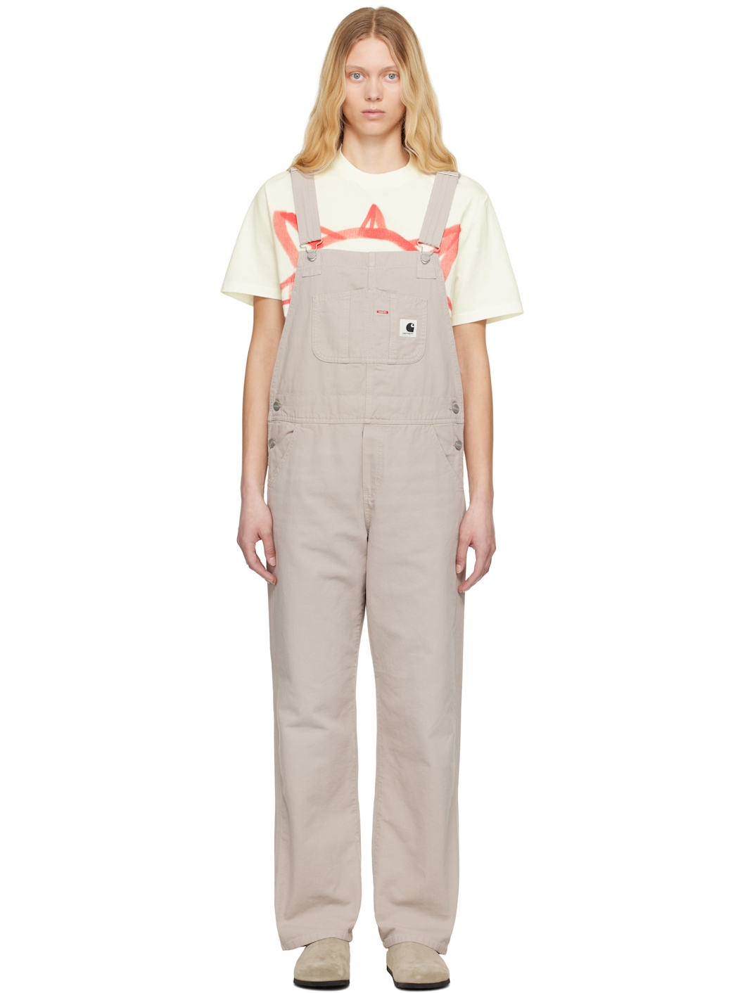 Straight-leg 9 oz cotton canvas overalls. · Square neck · Patch pockets at chest · Logo patch at chest and back pocket · Four-pocket styling · Mock fly · Button fastening at sides · Adjustable shoulder straps · Logo-engraved silver-tone hardware Supplier color: Dusty beige (stone canvas) 100% cotton. Made in Tunisia 251111F070004