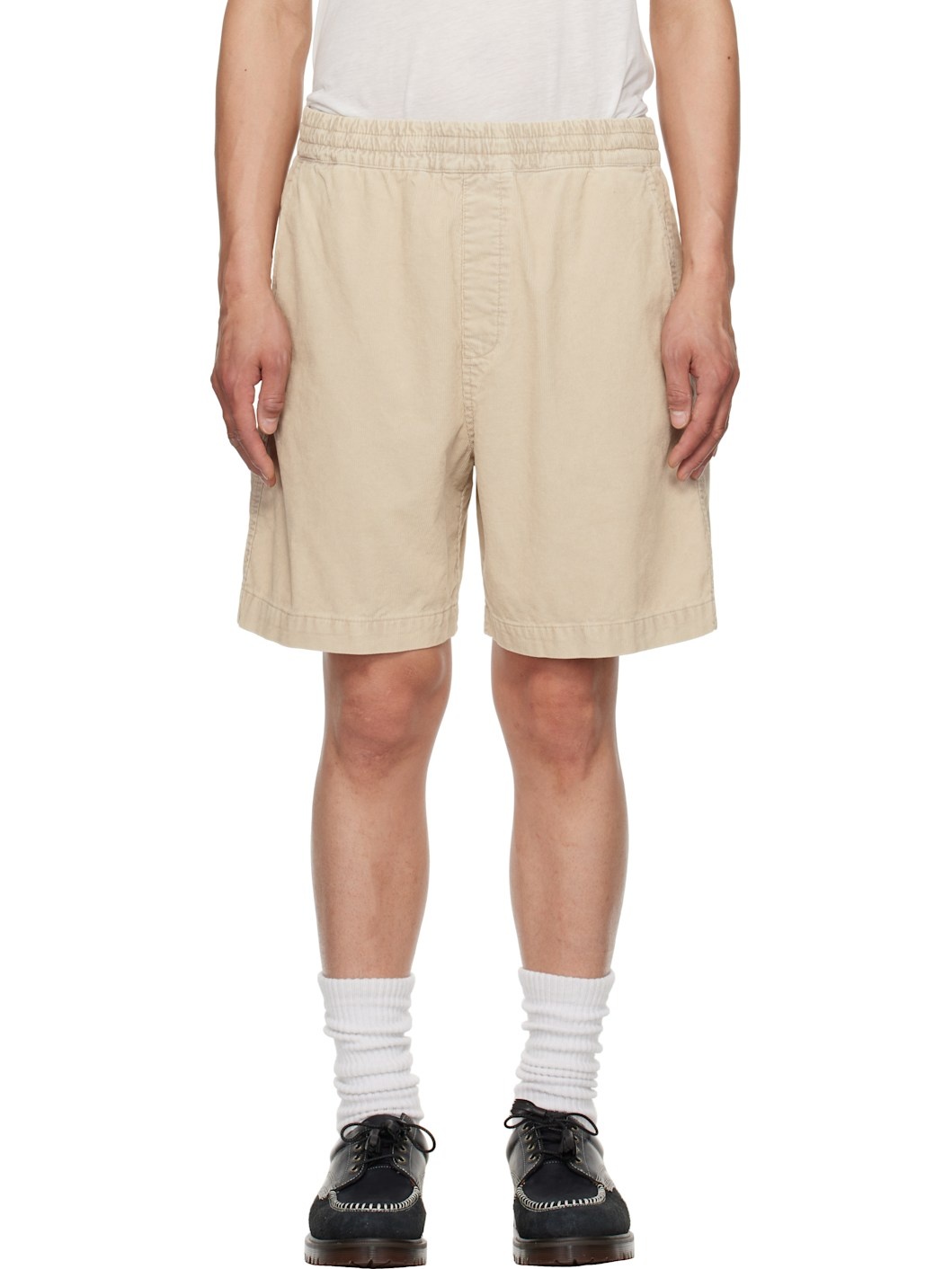 8 oz cotton corduroy shorts. · Mid-rise · Concealed drawstring at elasticized waistband · Three-pocket styling · Mock fly · Textile logo patch at back Supplier color: Dusky beige Body: 100% cotton. Lining: 65% polyester, 35% cotton. Made in Tunisia 251111M193015