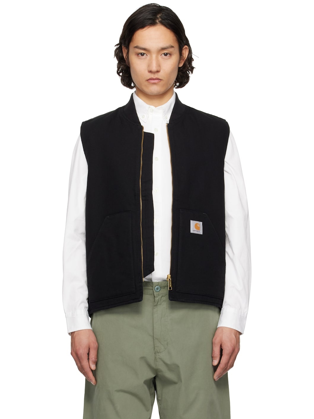 Insulated 12 oz organic cotton Dearborn canvas vest. · Rib-knit stand collar · Zip closure · Patch pockets · Logo patch at pocket · Droptail hem · Patch pocket at interior · Full quilted satin lining · Logo-engraved gold-tone hardware Supplier color: Black Body: 100% organic cotton. Fill: 100% polyester. Lining: 100% polyester. Made in Tunisia 251111M185009