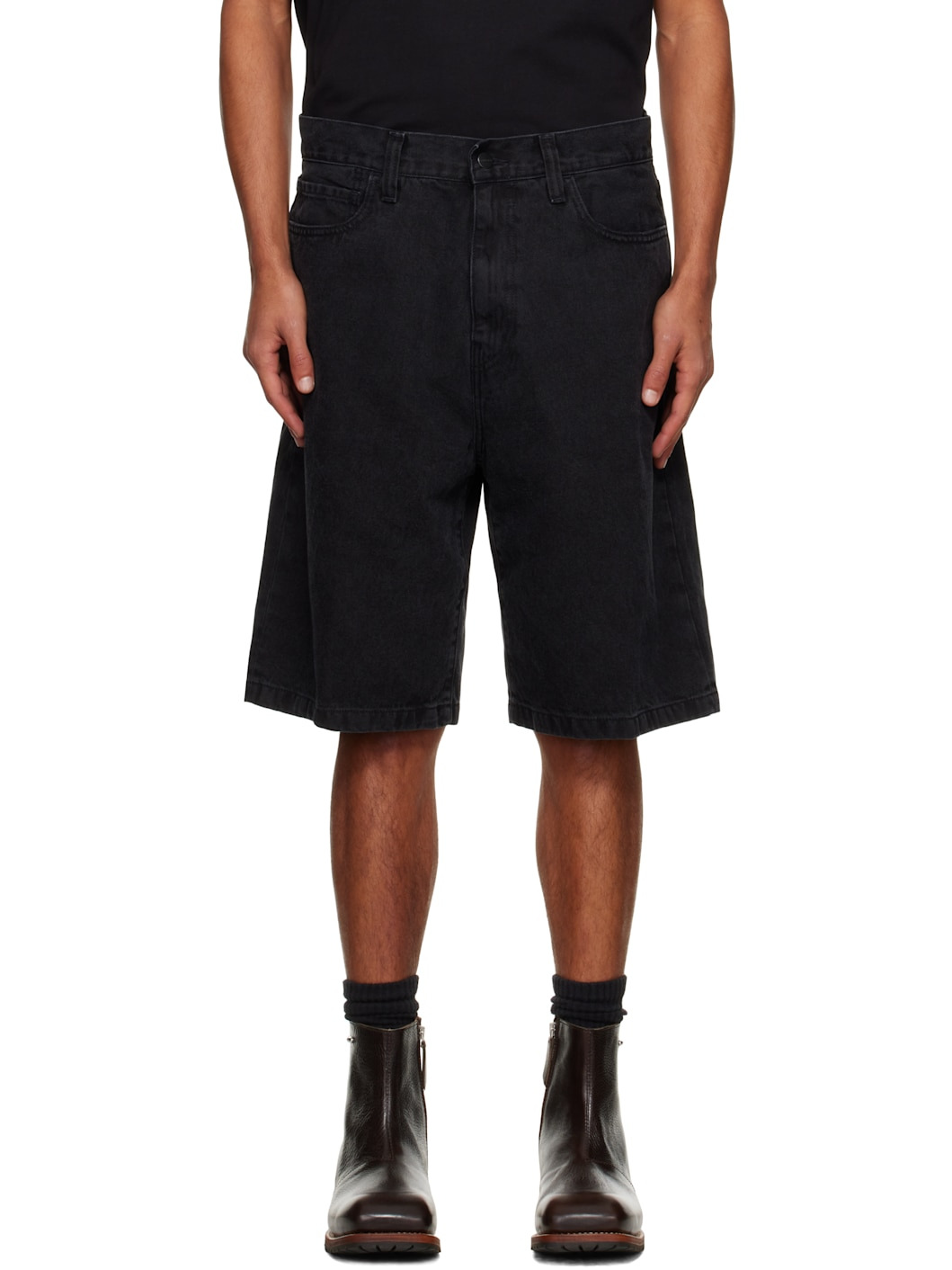 Stonewashed heavyweight 12 oz non-stretch denim shorts. · Fading throughout · Loose-fit · Mid-rise · Belt loops · Five-pocket styling · Zip fly · Logo patch at back pocket Supplier color: Black (Stone Washed) Body: 100% cotton. Pocket lining: 65% polyester, 35% cotton. Made in Tunisia 252111M193016
