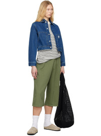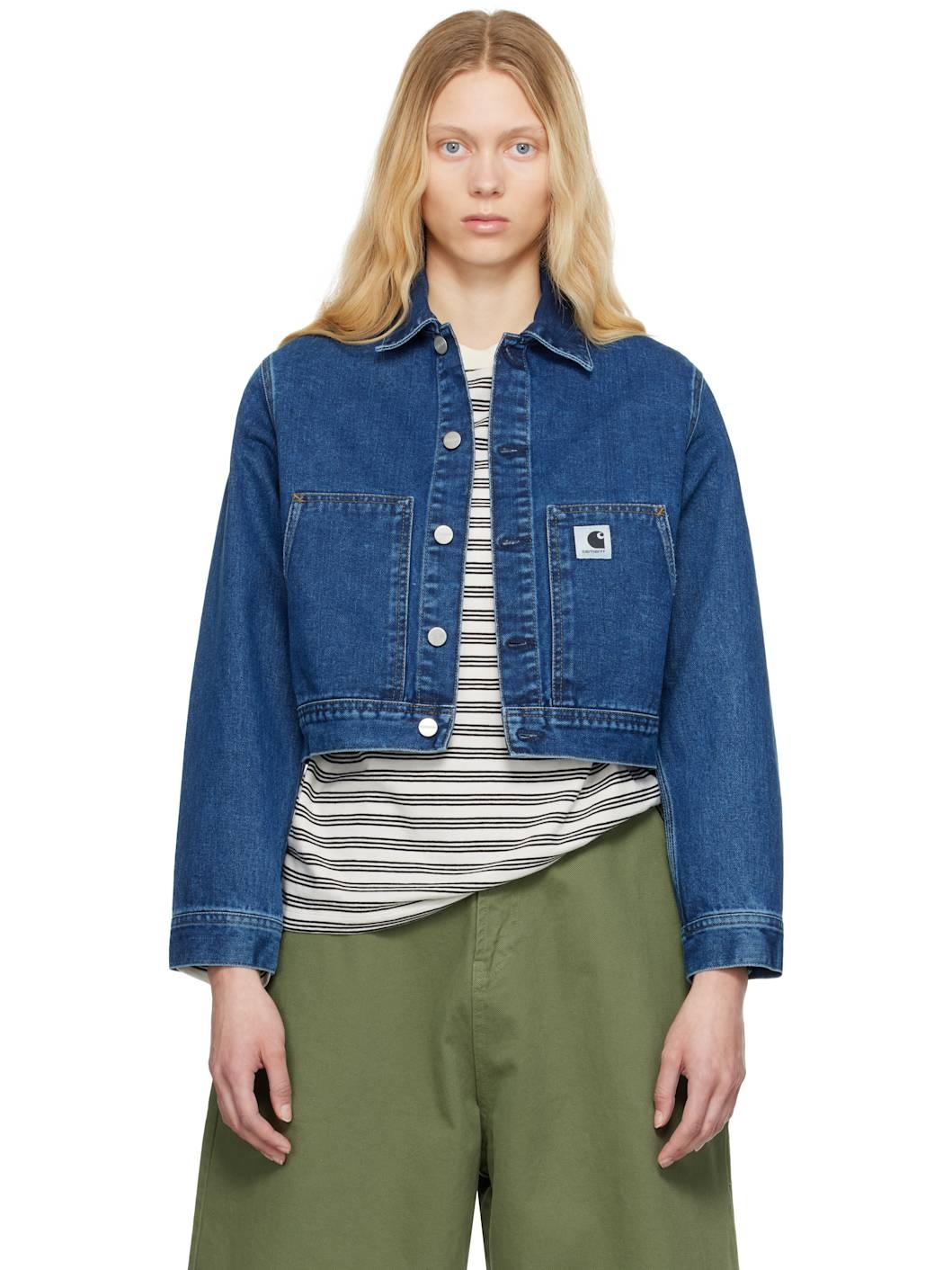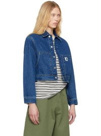 Stonewashed 13.5 oz non-stretch organic cotton denim jacket. Fading and subtle distressing throughout. · Loose-fit · Spread collar · Button closure · Logo patch at chest · Patch pockets · Cropped hem · Dropped shoulders · Adjustable buttoned barrel cuffs · Twin pleats at back hem · Logo-engraved silver-tone hardware · Contrast stitching in tan Supplier color: Blue (stone washed) 100% organic cotton. Made in Tunisia 251111F060004