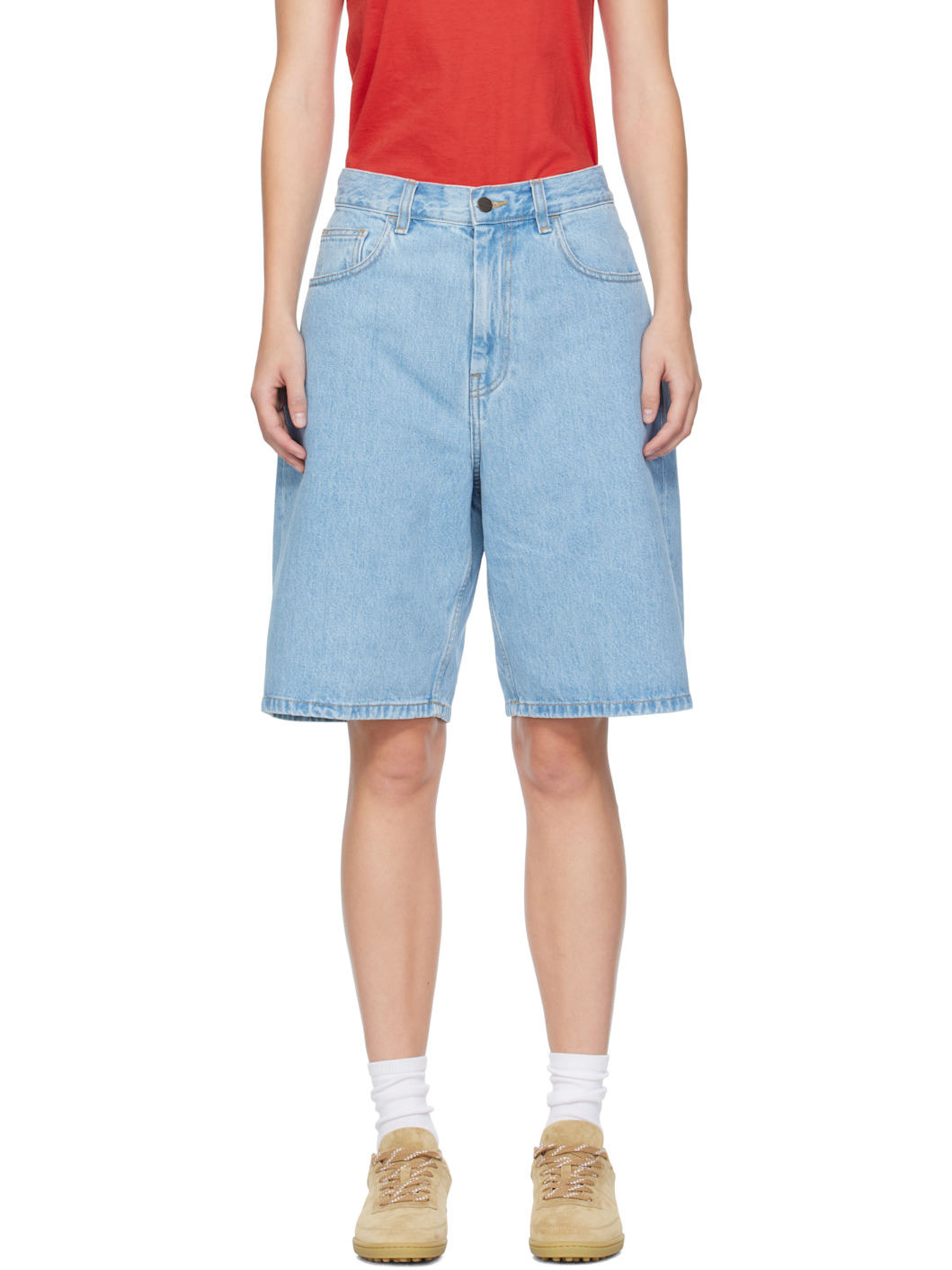 13.5 oz non-stretch denim shorts. · Fading throughout · Mid-rise · Belt loops · Five-pocket styling · Zip fly · Logo patch at back pocket · Contrast stitching in tan Supplier color: Blue (stone bleached) Body: 100% cotton. Trim: 65% polyester, 35% cotton. Made in Tunisia 252111F088002