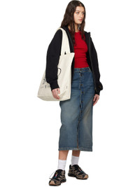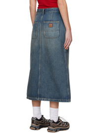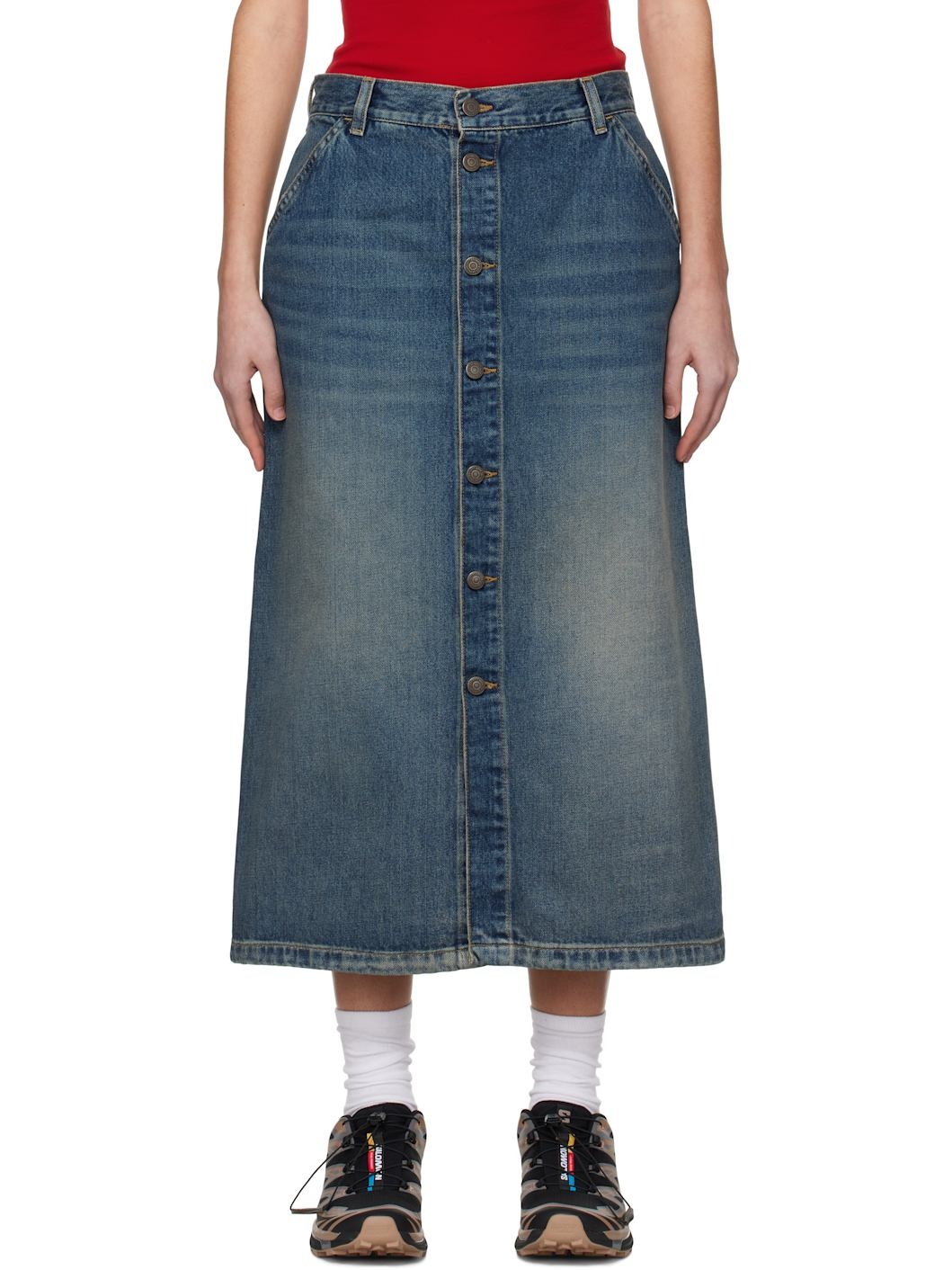 Heavyweight 13.5 oz non-stretch denim midi skirt. Fading, whiskering, and subtle distressing throughout. · Mid-rise · Belt loops · Four-pocket styling · Button closure · Logo patch at back pocket · Contrast stitching in beige Supplier color: Blue (worn used wash) Body: 100% cotton. Lining: 65% polyester, 35% cotton. Made in Tunisia 251111F092000