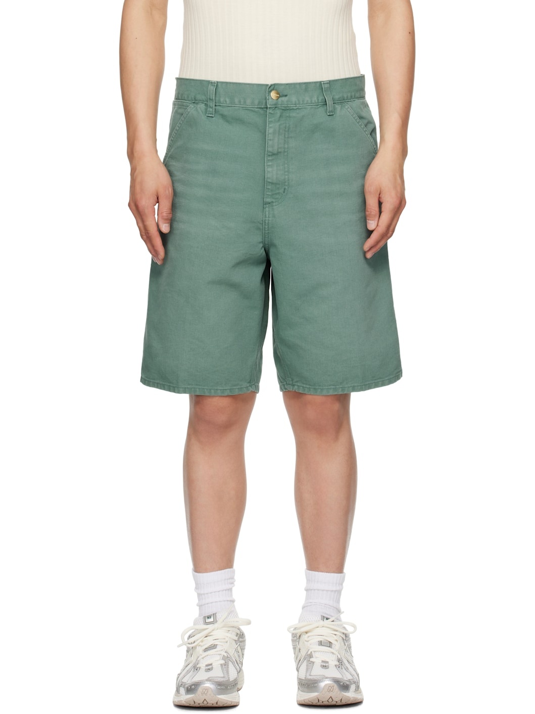 Heavyweight organic cotton Dearborn canvas shorts. Subtle fading and whiskering throughout. · Loose-fit and straight-leg · Belt loops · Five-pocket styling · Zip fly · Hammer loop at outseam · Patch pockets at outseams · Logo patch at back pocket · Logo-engraved gold-tone hardware Supplier color: Silver pine Body: 100% organic cotton. Lining: 65% polyester, 35% cotton. Made in Tunisia 251111M193062