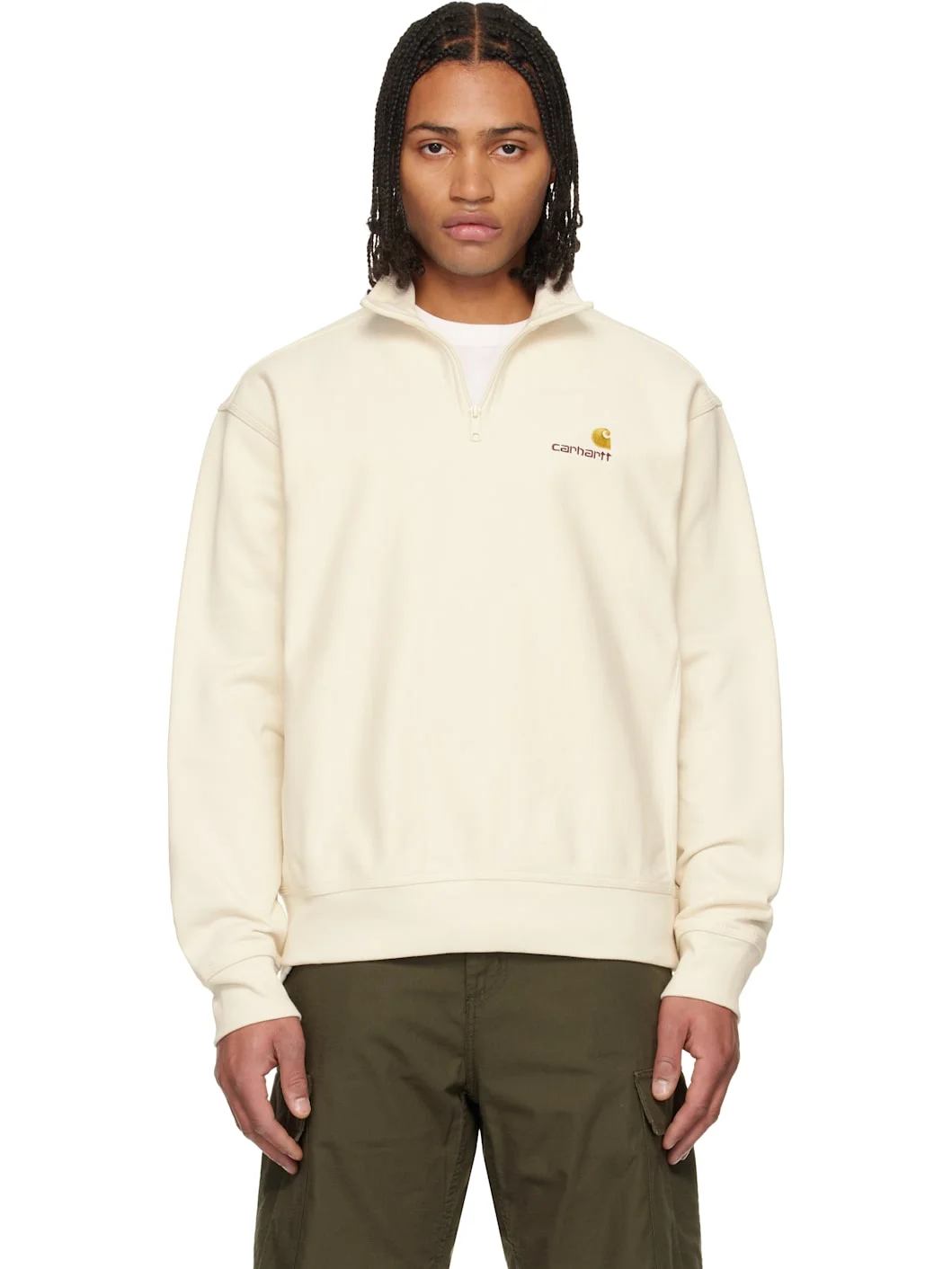 12.4 oz cotton-blend fleece sweatshirt. · Stand collar · Half-zip closure · Logo embroidered at chest · Rib-knit hem and cuffs Supplier color: Natural Body: 80% cotton, 20% polyester. Trim: 97% cotton, 3% elastane. Made in Cambodia 261111M202001