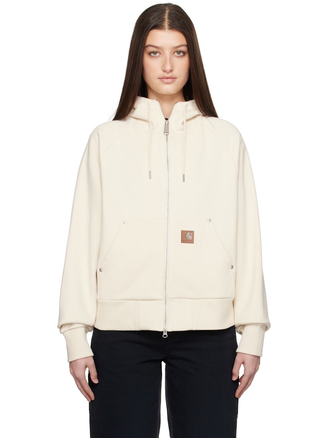 Loose- and boxy-fit cotton-bend French terry hoodie. · Drawstring at hood · Two-way zip closure · Faux-leather logo patch and rivets at front · Patch pockets · Rib-knit hem and cuffs · Raglan sleeves · Logo-engraved silver-tone hardware Supplier color: Natural Body: 87% cotton, 13% polyester. Trim: 96% cotton, 4% polyester. Made in Bangladesh 251111F097003