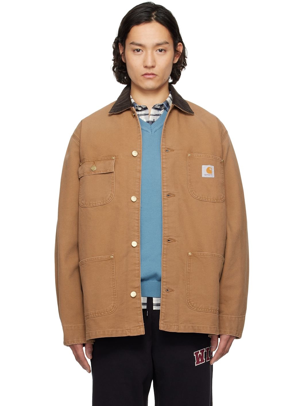 Loose-fit 12 oz organic cotton Dearborn canvas jacket. · Corduroy spread collar · Button closure · Flap pocket and patch pockets · Logo patch at chest · Adjustable barrel cuffs · Unlined · Logo-engraved gold-tone hardware Supplier color: Hamilton Brown/Tobacco (aged canvas) 100% organic cotton. Made in Tunisia 251111M180076