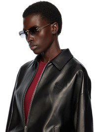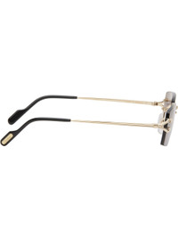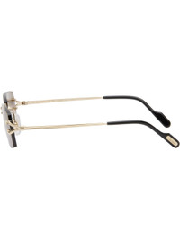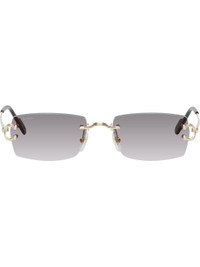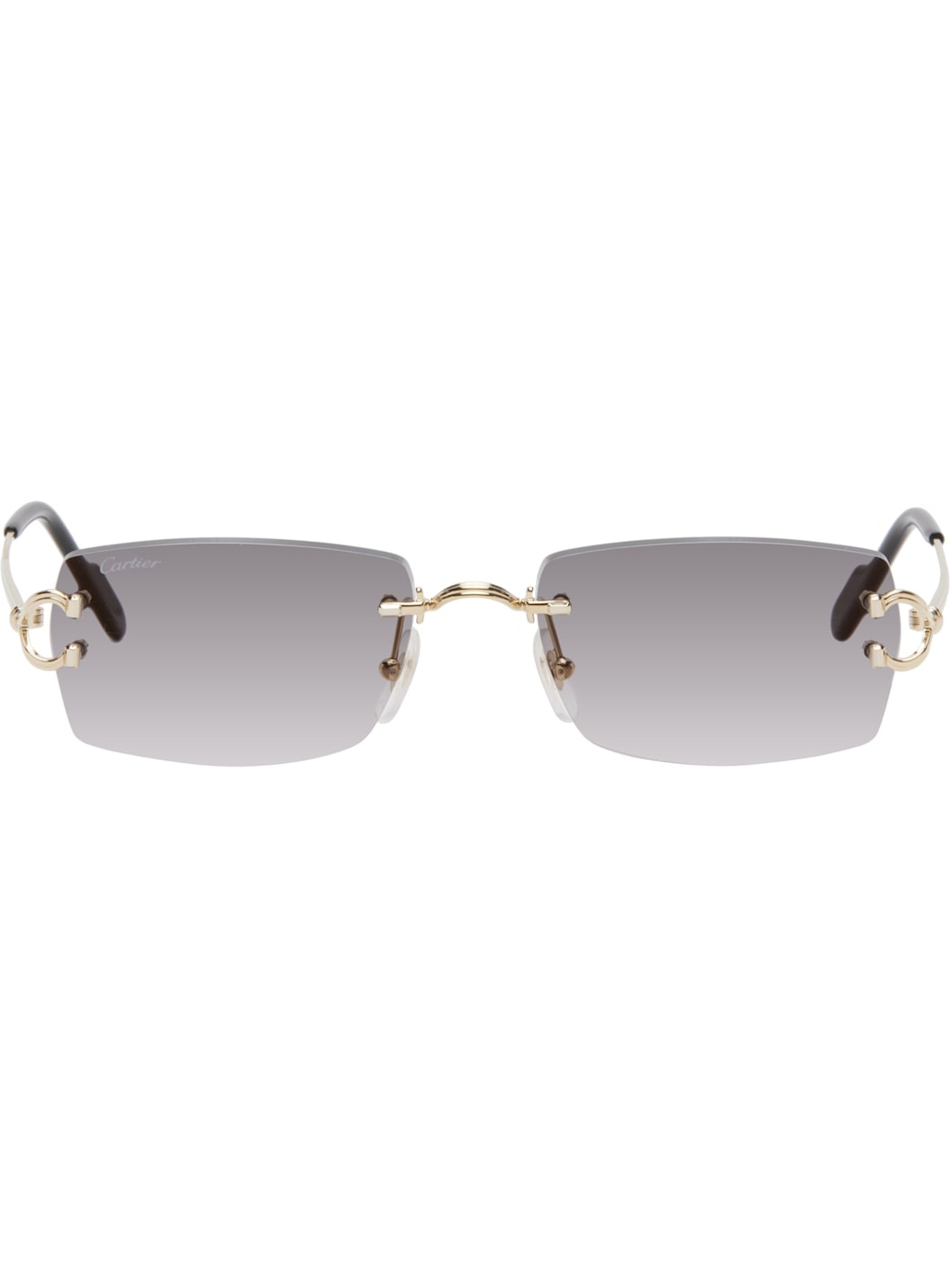 Rectangular rimless metal-frame sunglasses in gold tone. · Mirrored gray lenses · 100% UVA/UVB protection, category 2 · Logo etched at lens · Integrated nose pads · Logo hardware at hinges · Logo plaque at black acetate temple tips · Includes case · Size: 55.18 140 Part of the Decor C de Cartier collection. Supplier color: Gold Metal, acetate. Made in France 252346F005004