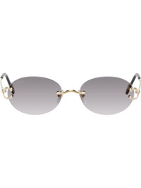 Round rimless metal-frame sunglasses in gold tone. · Gray gradient lenses · 100% UVA/UVB protection, category 2 · Logo etched at lens · Integrated nose pads · Logo hardware at hinges · Logo plaque at black acetate temple tips · Includes case · Size: 55.18 140 Part of the Decor C de Cartier collection. Supplier color: Gold Metal, acetate. Made in France 252346F005002