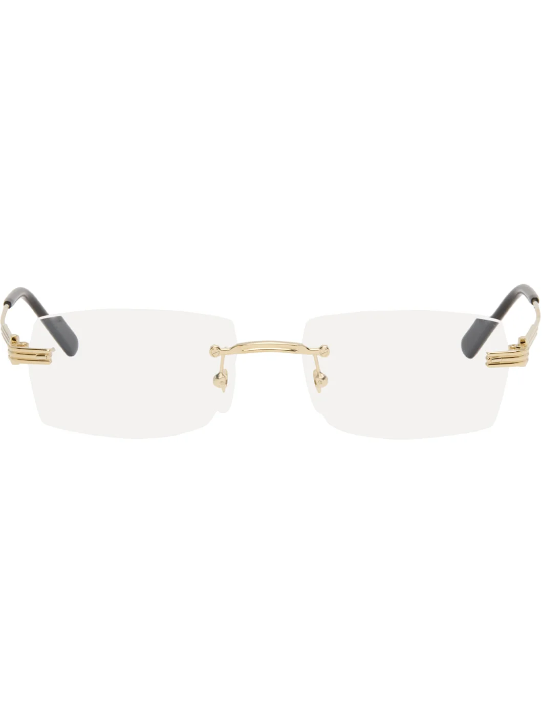 Rectangular rimless metal-frame optical glasses. · Adjustable rubber nose pads · Logo hardware at temples · Logo plaque at acetate temple tips · Includes case · Size: 55.17 145 Supplier color: Gold Metal, acetate. Made in France 261346F004000