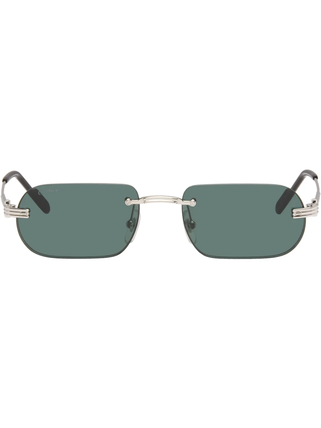 Rectangular rimless metal-frame sunglasses. · Green lenses · Logo etched at lens · Adjustable rubber nose pads · Logo hardware at temples · Logo plaque at acetate temple tips · Includes case · Size: 55.18 145 Supplier color: Silver/Silver/Green Metal, acetate. Made in France 261346M134017