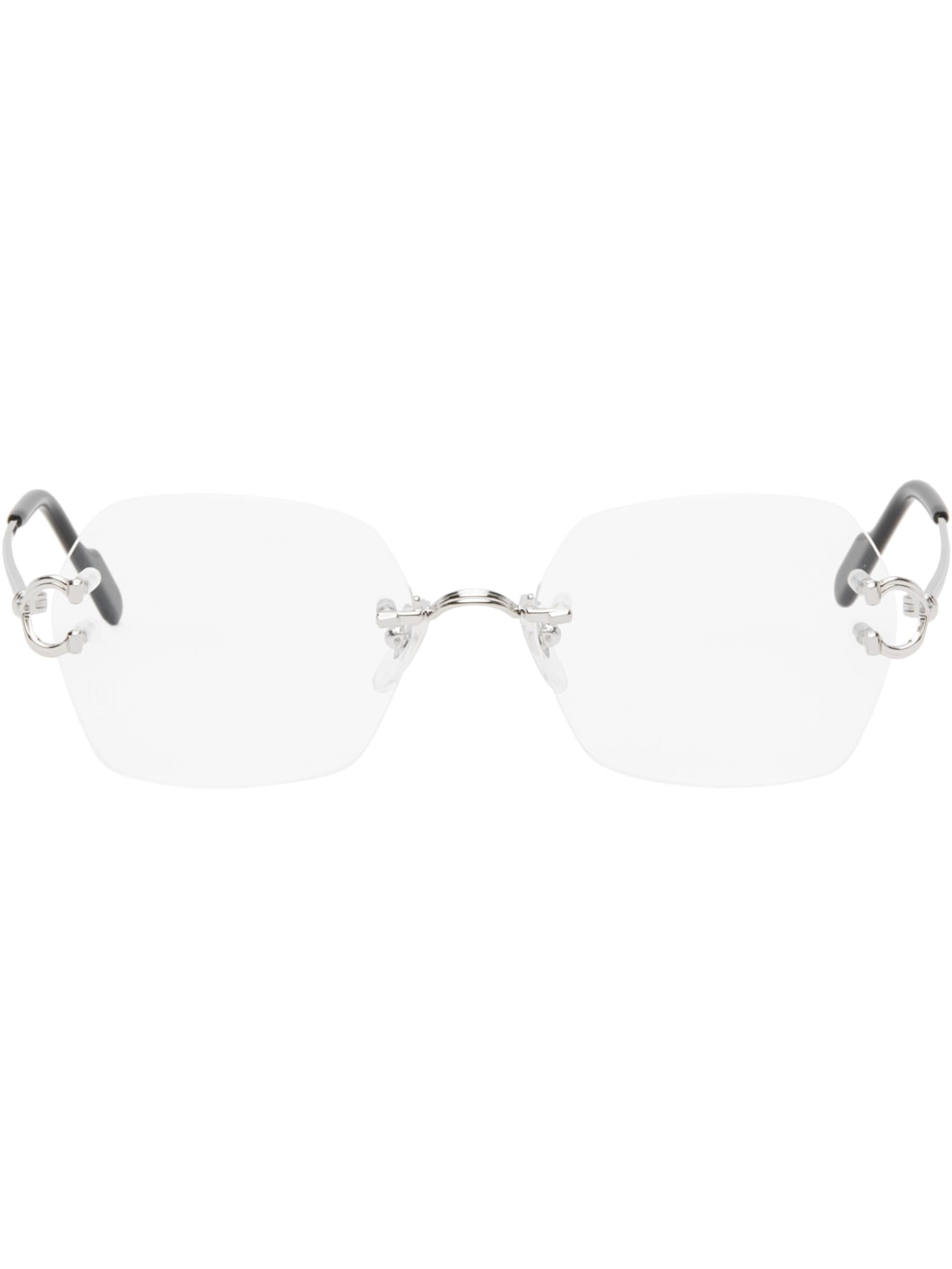 Hexagonal rimless metal-frame optical glasses in silver tone. · Adjustable rubber nose pads · Logo hardware at hinges and tips · Acetate temple tips in black · Includes case · Size: 55.18 140 Part of the Signature C de Cartier collection. Supplier color: Silver Metal. Made in France 252346F004002