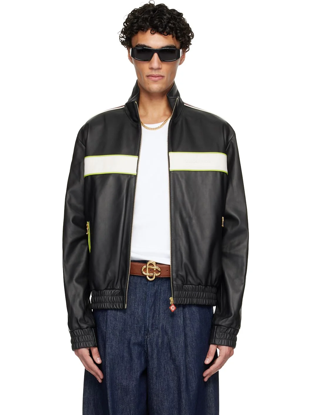 Grained lambskin jacket. · Piping throughout · Stand collar · Zip closure · Stripe applique at front and sleeves · Logo embroidered at chest · Zip pockets at waist · Elasticized hem and cuffs · Full satin lining Supplier color: Black Body: 100% lambskin. Trim: 100% cotton. Lining: 100% viscose. Made in Turkey 261195M181000