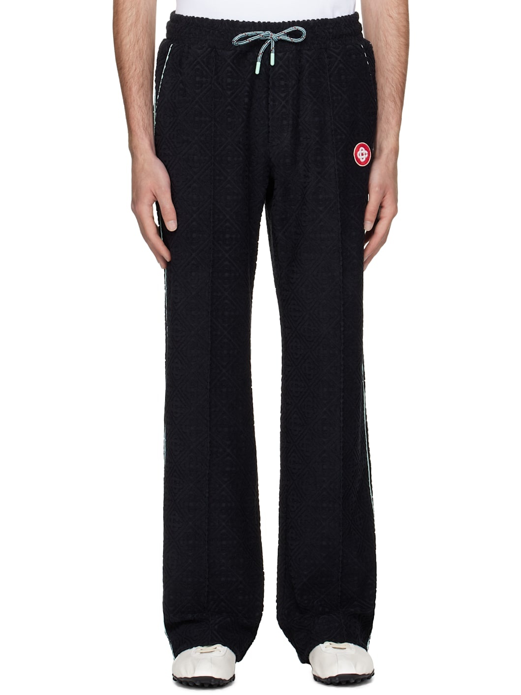 Stretch cotton-blend terrycloth sweatpants. · Jacquard logo graphic pattern throughout · Drawstring at elasticized waistband · Three-pocket styling · Mock fly · Embroidered logo graphic patch at front · Piping at outseams Supplier color: Black Body: 86% cotton, 13% polyamide, 1% elastane. Trim 1: 100% polyester. Trim 2: 95% viscose, 5% polyester. Made in Portugal 252195M190002