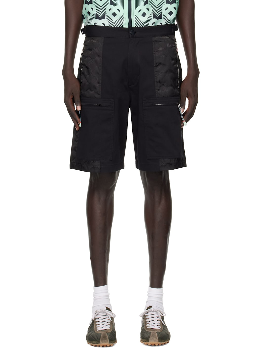Stretch organic cotton twill and nylon twill cargo shorts. · Jacquard graphic pattern throughout · Four-pocket styling · Zip fly · Zip pockets at front legs · Cinch strap at waistband outseams · Embroidered logo patch at back Supplier color: Black Body 1: 97% organic cotton, 3% elastane. Body 2: 100% nylon. Trim: 100% cotton. Made in Italy 252195M193000
