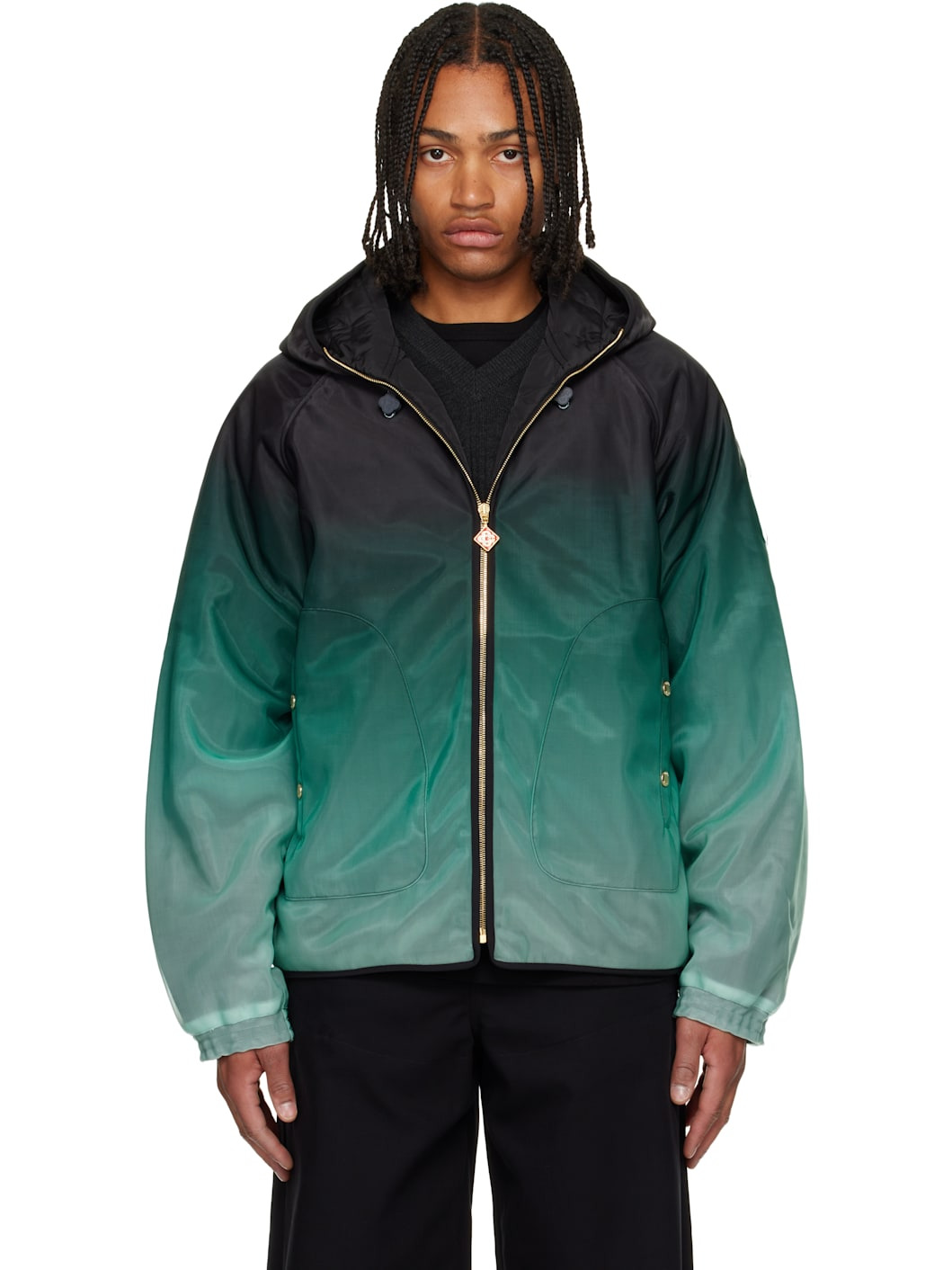 Moire jacket. · Gradient throughout · Bungee-style drawstring at hood · Zip closure · Patch pockets at front · Raglan sleeves · Rubber logo patch at sleeve · Elasticized cuffs · Patch pocket at interior · Full quilted plain-woven lining Supplier color: Gradient Body: 100% polyester. Fill: 100% polyester. Trim: 100% polyvinyl chloride. Lining 1: 88% polyamide, 12% elastane. Lining 2: 100% polyester. Made in Italy 252195M180003