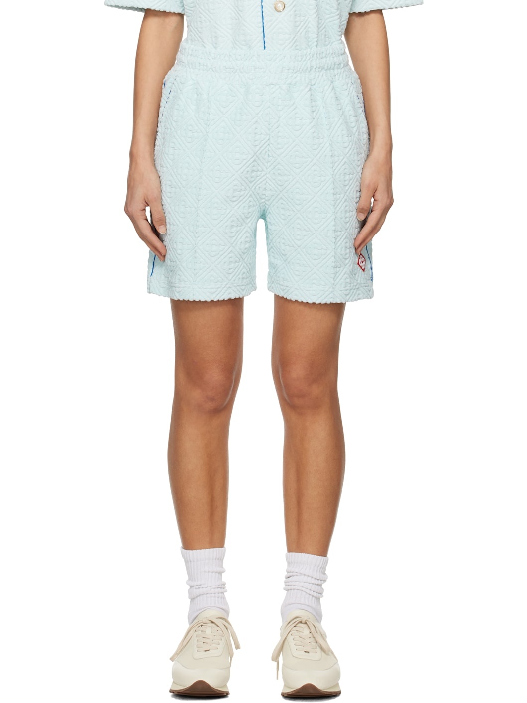 Stretch cotton-blend terrycloth shorts. Jacquard logo pattern and piping throughout. · Concealed drawstring at elasticized waistband · Three-pocket styling · Embroidered logo patch at front · Pinched seam at legs · Vented cuffs Supplier color: Light blue Body: 86% cotton, 13% polyamide, 1% elastane. Trim: 100% polyester. Lining: 100% cotton. Made in Portugal 251195F088001