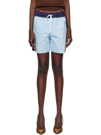 Cotton-blend canvas shorts. Jacquard logo graphic pattern and satin trim throughout. · Paneled construction · Drawstring at elasticized waistband · Three-pocket styling · Embroidered logo patch at front · Stripes at outseams · Full recycled polyester mesh lining · Gold-tone hardware Supplier color: Blue Body: 97% cotton, 3% viscose. Trim 1: 100% polyester. Trim 2: 100% polyester. Trim 3: 95% viscose, 5% polyester. Lining: 100% recycled polyester. Made in Portugal 251195F088004