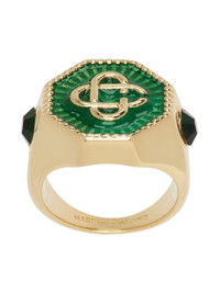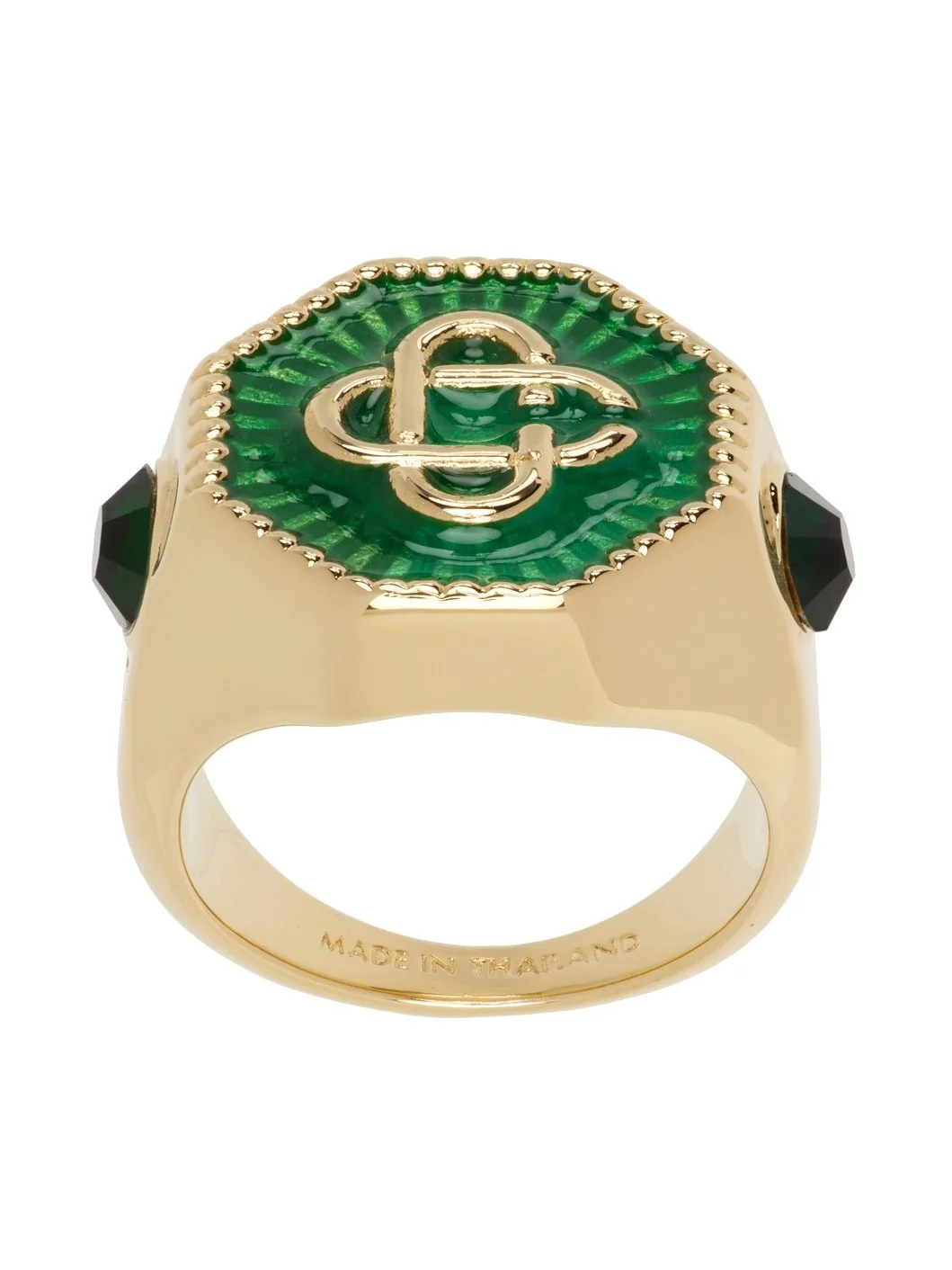 Signet ring in gold-tone brass. · Green enamel and logo at face · Green glass crystals at sides Supplier color: Green/Gold
