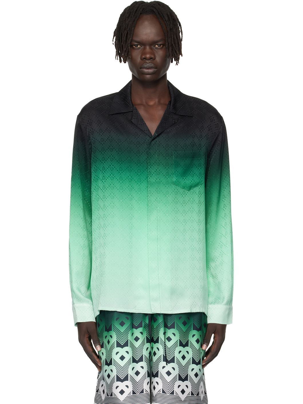 Silk satin shirt. · Gradient and jacquard logo pattern throughout · Spread collar · Concealed button closure · Patch pocket at chest · Buttoned barrel cuffs Supplier color: Gradient 100% silk. Made in Italy 252195M192004