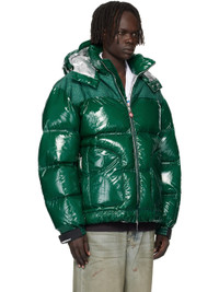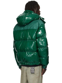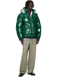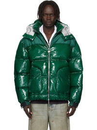 Down-filled and quilted nylon ripstop jacket. · Bungee-style drawstring at detachable hood · Funnel neck · Two-way zip closure · Panel with jacquard logo pattern at front and back yoke · Zip pockets at waist · Elasticized hem and cuffs · Logo-printed velcro tab at cuffs · Full taffeta lining · Logo-engraved silver-tone hardware Supplier color: Green Fill: 80% down, 20% feathers. Body: 100% polyamide. Trim: 100% polyester. Lining: 100% polyamide. Made in Italy 252195M178000