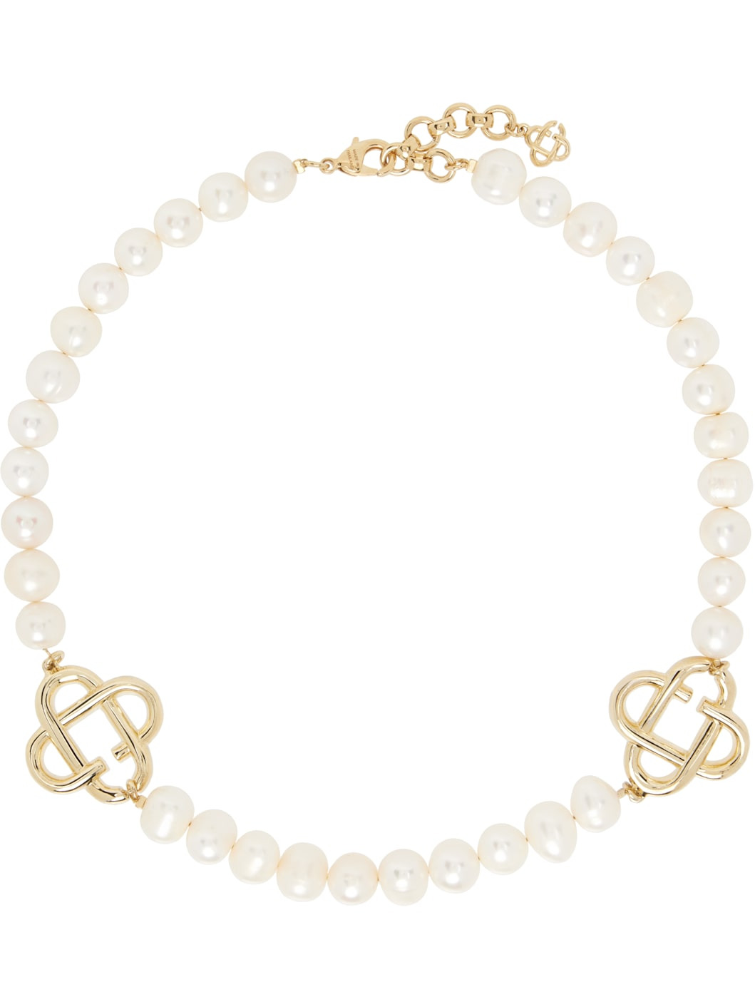 Beaded freshwater pearl necklace in white. · Logos at front · Logo charm at adjustable lobster clasp · Gold-tone brass hardware · L22.5" Supplier color: Gold/Pearl Freshwater pearl, brass. Made in Thailand 252195M145001