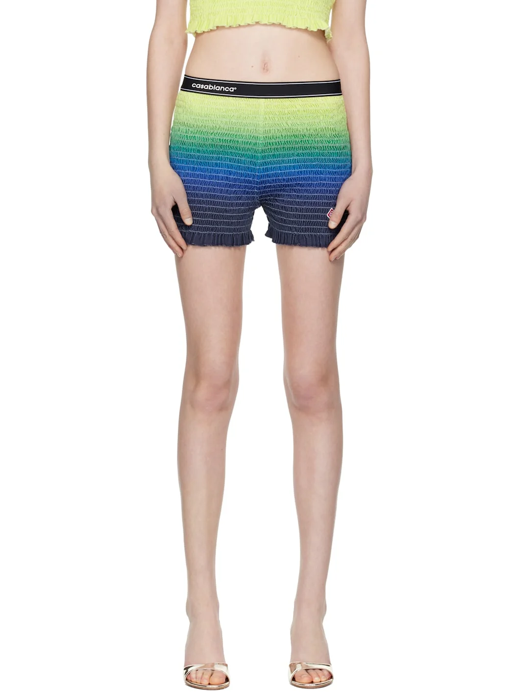 Cotton jersey shorts. · Shirring and gradient throughout · Logo bonded at elasticized waistband · Logo patch at front · Lettuce edge at cuffs Supplier color: Multicolour Body 1: 100% cotton. Body 2: 95% recycled polyester, 5% elastane. Trim: 100% viscose. Made in Portugal 261195F088006