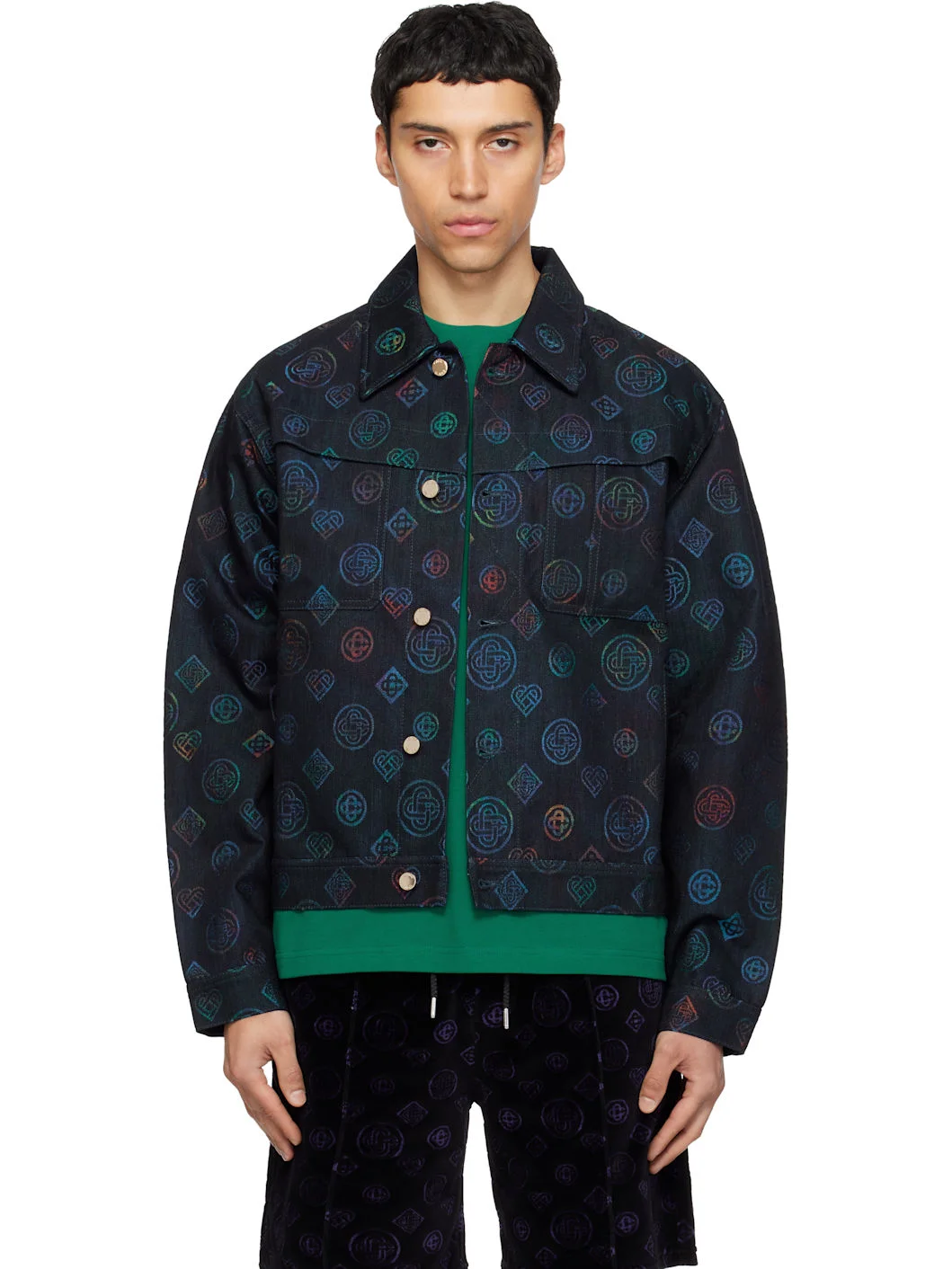 Non-stretch denim jacket. · Jacquard logo pattern throughout · Spread collar · Button closure · Flap pockets at chest · Welt pockets at waist · Dropped shoulders · Buttoned barrel cuffs · Adjustable button tabs at back hem · Logo-engraved gold-tone hardware Supplier color: Navy Body: 100% cotton. Pocket lining: 65% polyester, 35% cotton. Made in Italy 261195M177001