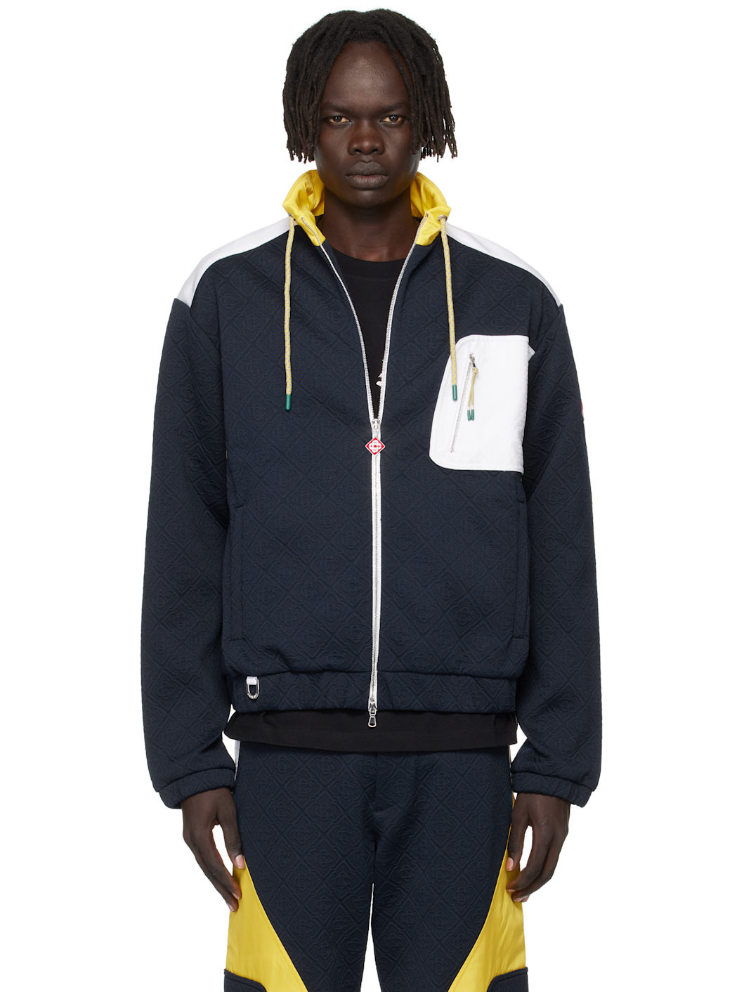 Plain-woven nylon-blend jacket. · Jacquard logo pattern throughout · Drawstring at stand collar · Two-way zip closure · Zip pockets at front · D-ring at front hem · Elasticized hem and cuffs · Eyelet at underarms · Embroidered logo patch at sleeve · Full mesh lining · Logo-enameled silver-tone hardware Supplier color: Navy Body: 65% polyester, 18% polyamide, 17% cotton. Trim 1: 100% recycled polyester. Trim 2: 96% polyamide, 4% polyurethane. Lining: 100% polyester. Made in Portugal 252195M180006